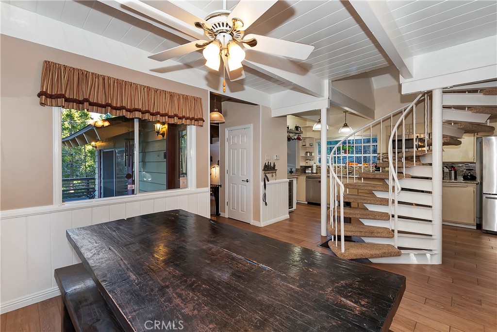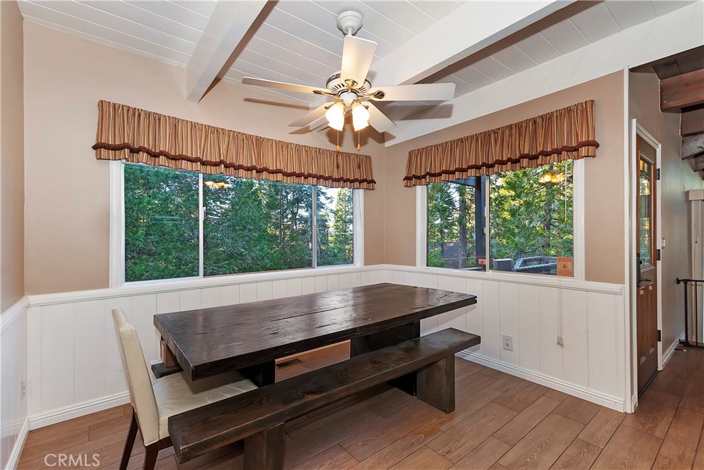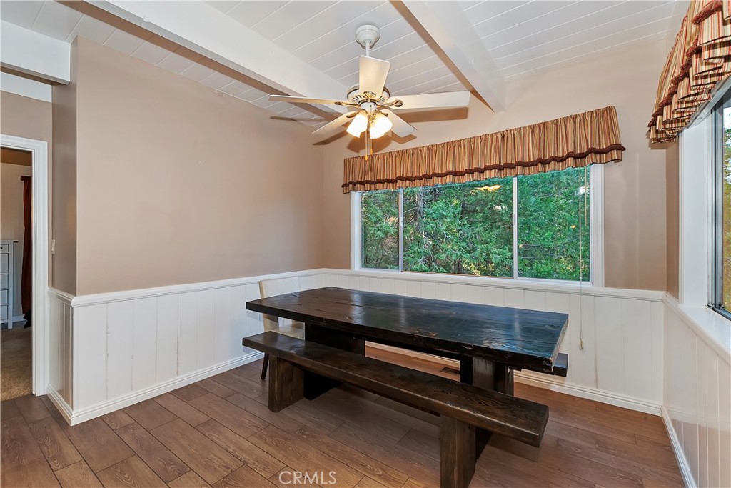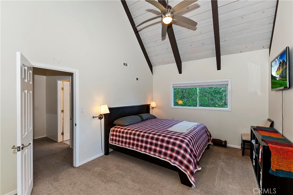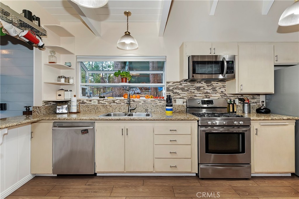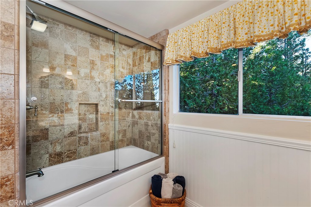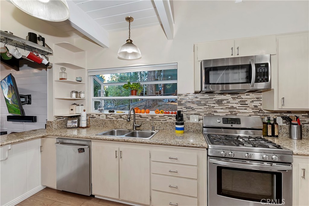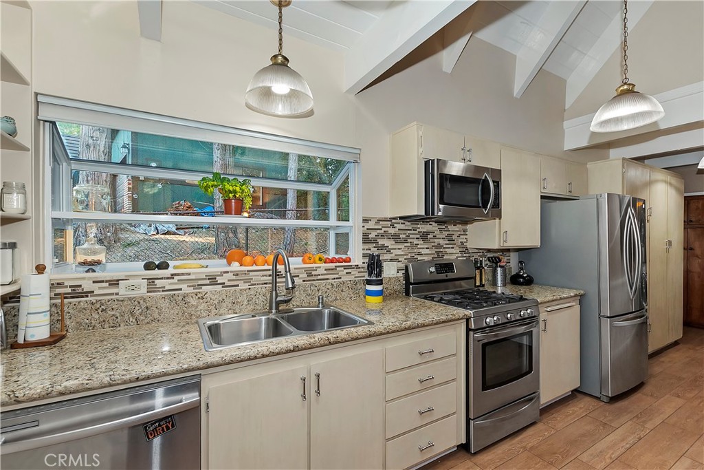 Pride of Ownership throughout this updated 3 bedroom, 2 bathroom, 1552 SF turnkey home with two car detached garage and "Lake Rights" to private Lake Arrowhead. Open floor plan with wood beamed ceilings and cozy fireplace in living room which opens to kitchen and dining room. Kitchen features granite counters, stainless appliances including wine fridge, upgraded wood-like tile floor, large pantry, laundry area and access to backyard. Primary bedroom with en suite bath complete the main level. Upstairs you will find two spacious bedrooms with oversized closets and secondary bathroom. Hidden updates that you won't see include PEX plumbing and new sewer line. Truly a charming tree-house feel to this immaculate cabin which is ideal for entertaining with large deck that has a 7000 BTU UV heater to keep you warm on cool mountain evenings and a level fenced back yard. Schedule your showing today!