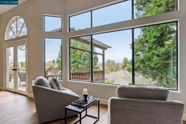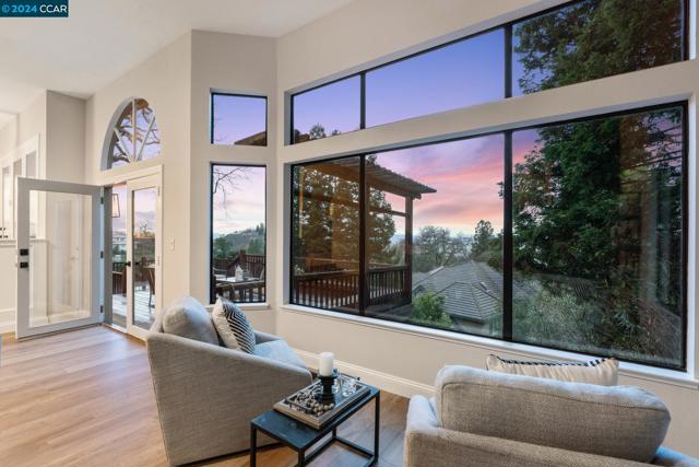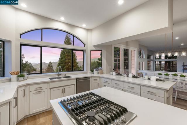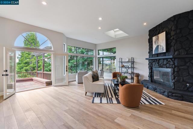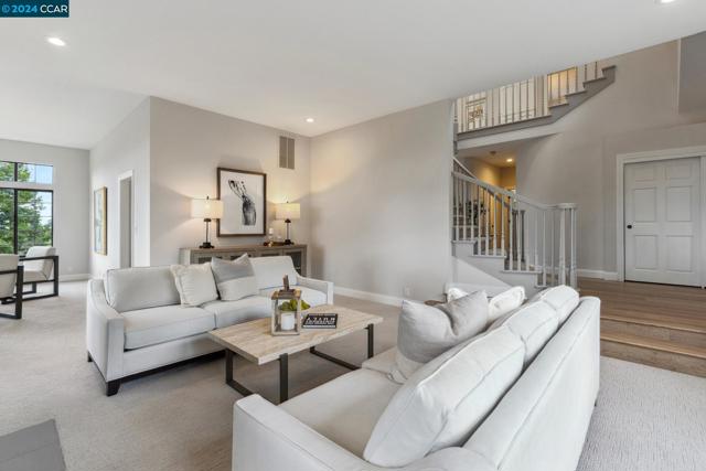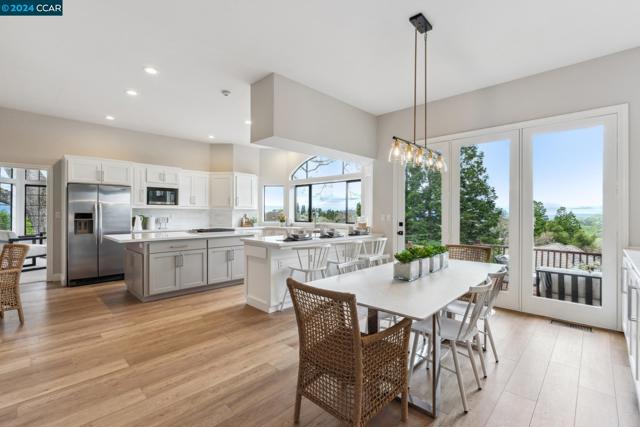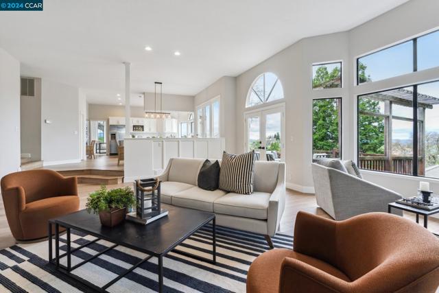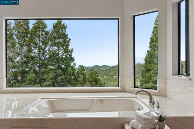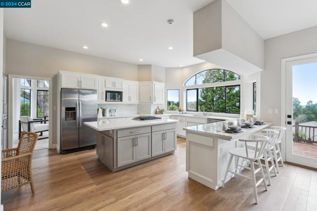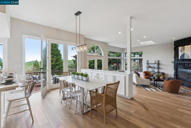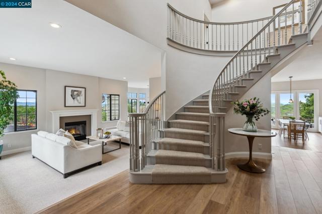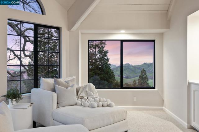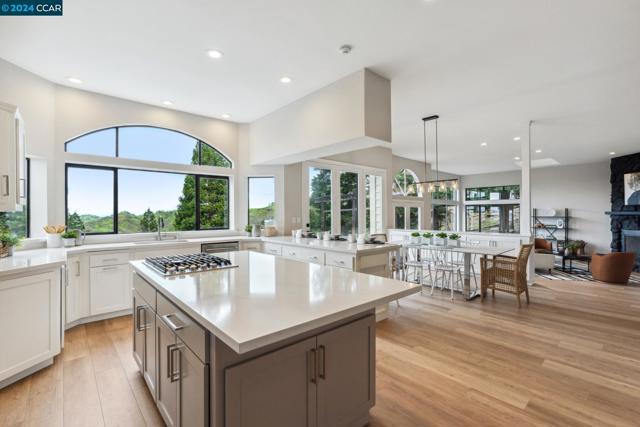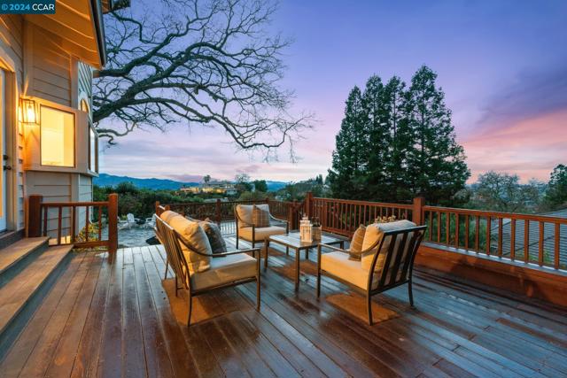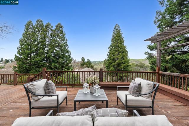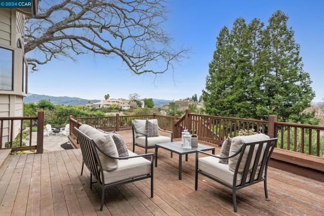Light-filled, spacious and peaceful property with views located on a cul de sac in prestigious Roundhill North! Walls of windows and soaring ceilings bring the outside in to this traditional and open floorplan. The living and dining rooms are encompassed by an iconic well-cared-for oak tree. Updated kitchen with large island, beautiful cabinetry and quartz countertops opens to an extensive family room. Both rooms face an expansive deck with views of the surrounding hills. Enjoy the sunset while entertaining on the deck or stone patio with plenty of room for a grass or turf play area. One bedroom with full bath on the main level. A curved staircase leads to an impressive second level with angled ceilings, massive primary suite, another en-suite bedroom and super cool “loft-like” bedroom with fun area for kids to hang out. 3 car garage. 1.7 miles to Roundhill Country Club with swimming, bocce, tennis and golf. Open Saturday and Sunday 1-4pm.