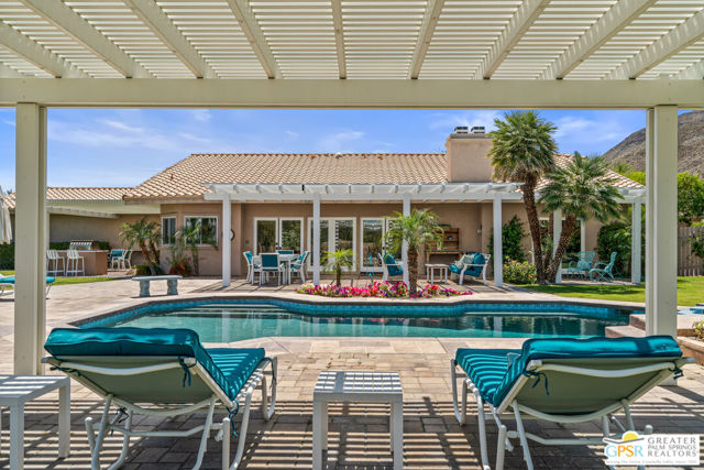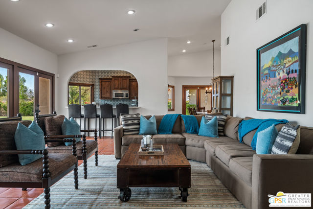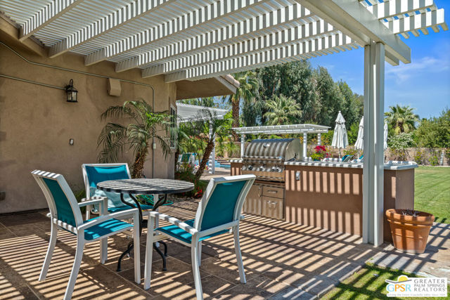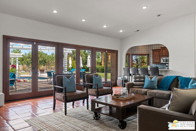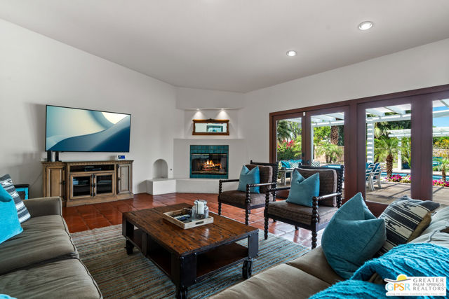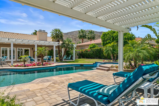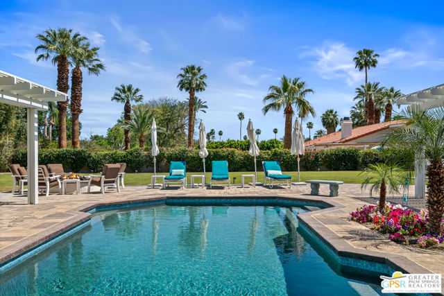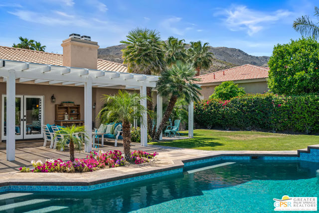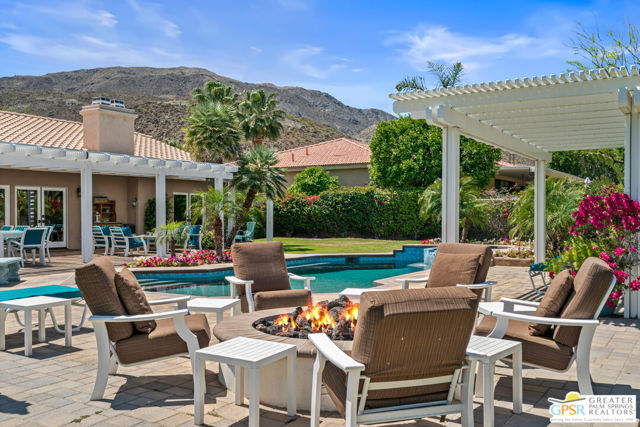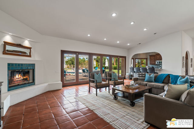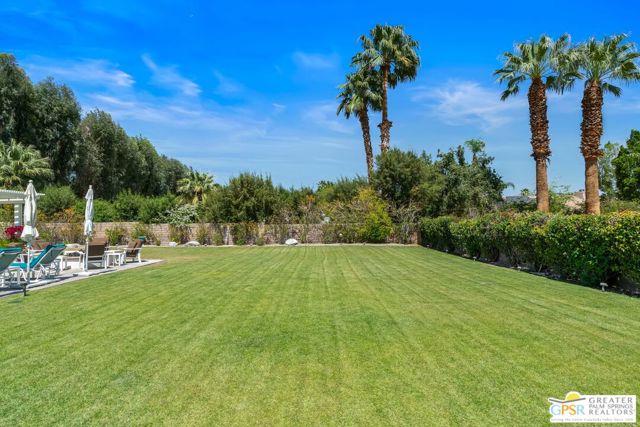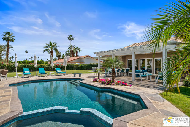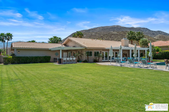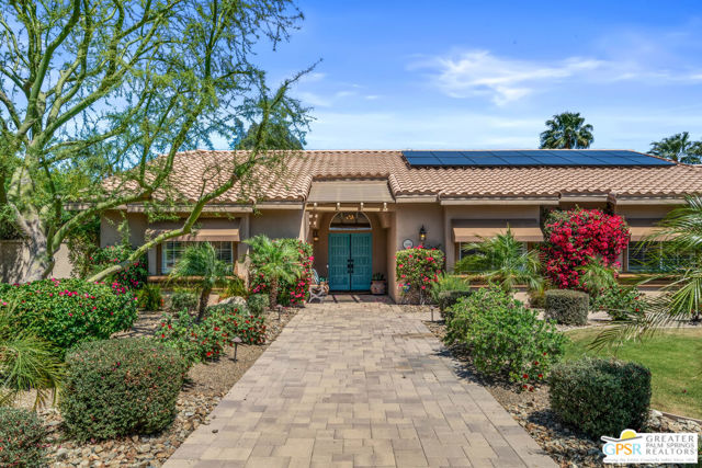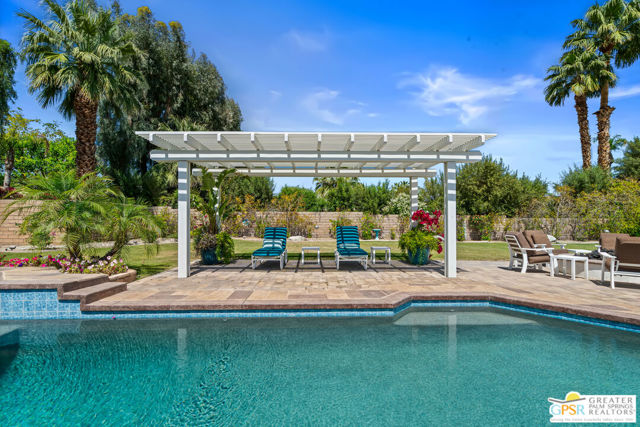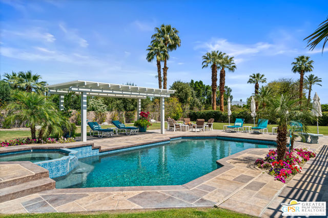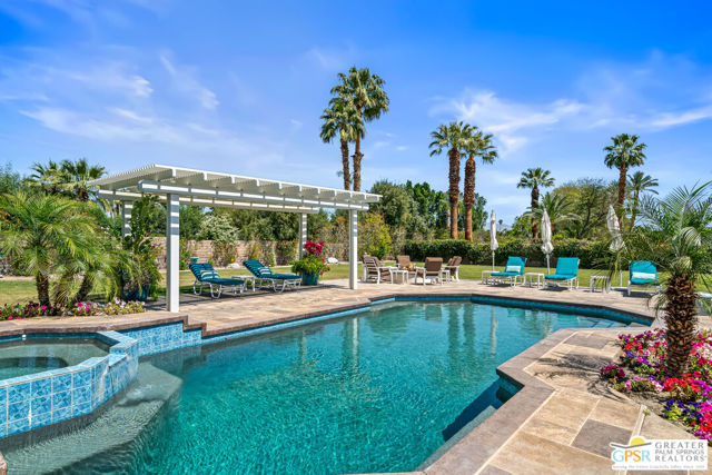 If you've been looking for a home with incredible outdoor space in the rancho Mirage Palm Desert area, this is it! This 4 bedroom 4 bath home is a hidden gem. Located in Rancho Mirage right adjacent to Palm Desert, this property has the outdoor space dreams are made of. Start off with a beautiful pool and spa which has recently been refurbished with new tile and plaster. Large outdoor covered living/dining area, new fire pit conversation area, Built-in outdoor barbecue for your cooking needs, and a massive lawn ready for you to enjoy as it is, or build your own pickleball paradise or sports court...it's not even a tight fit! The home is beautifully finished with a modern Spanish theme. 6 Custom French doors lead to the yard. The home has refinished Spanish tile floors throughout. Custom bathroom vanities and artistic tile and sinks in each bathroom. Completely custom kitchen with new cabinetry, quartz counters with a custom tile full backsplash and top of the line stainless steel appliances. Fireplaces in the Primary bedroom as well as the living room. 3 FULL SIZED garage spaces and large driveway will accommodate your fleet of vehicles. The home has 2 complete sets of washer/dryers. Keep cool with a whole house AC system, additionally, the 2 Primary bedrooms have their own mini-split AC/heaters. OWNED SOLAR will save you money as well. If you are looking to create a family compound (2 homes), please see the listing at 72218 Barbara which is also available for sale and adjacent. No HOA, You own the land!