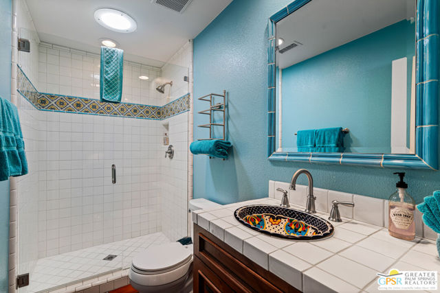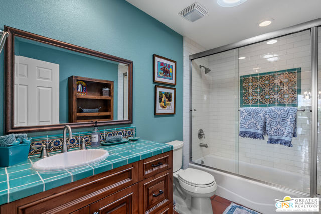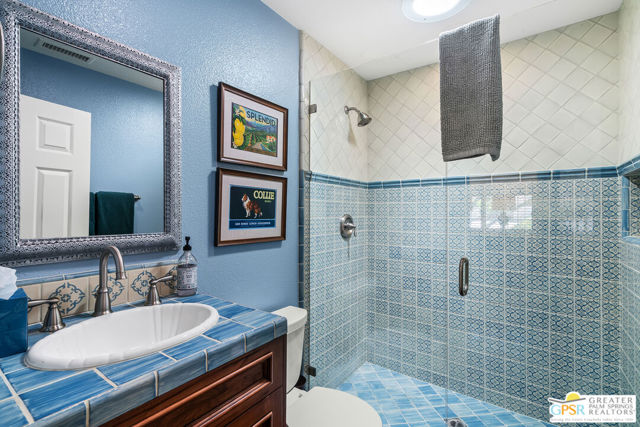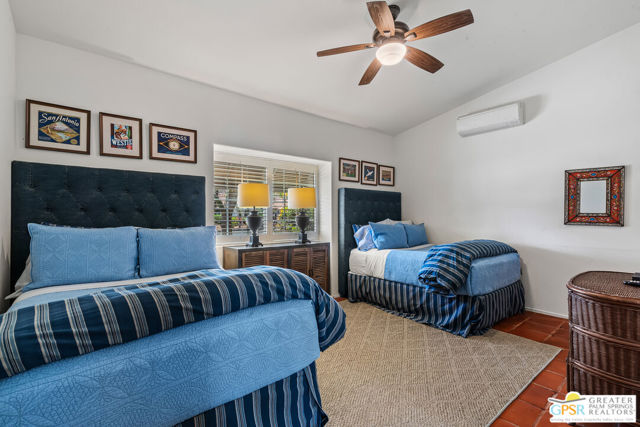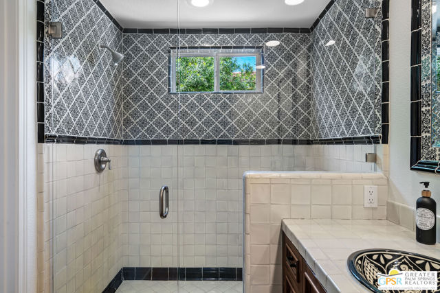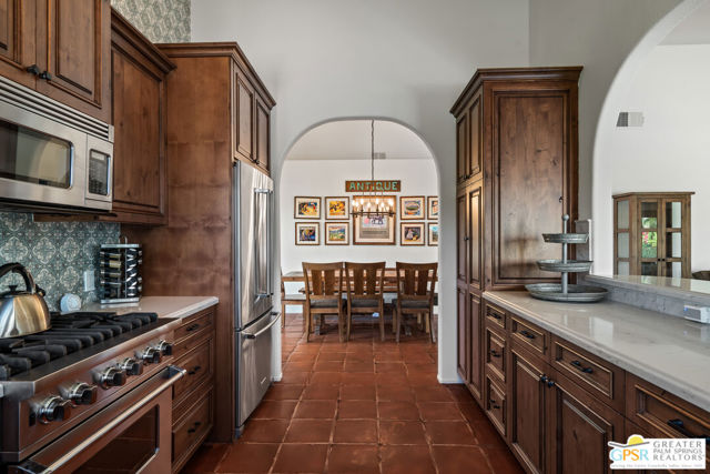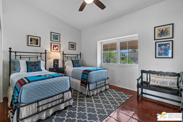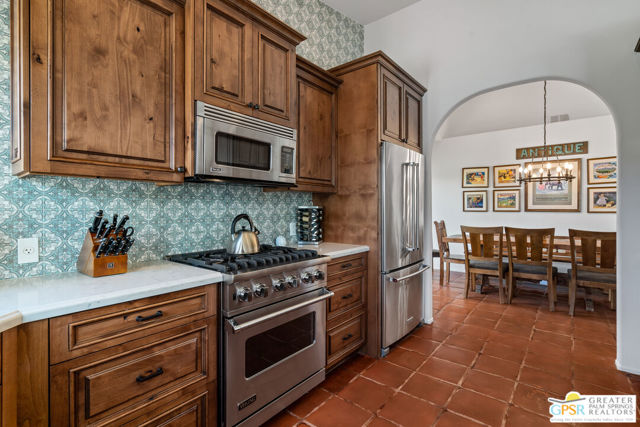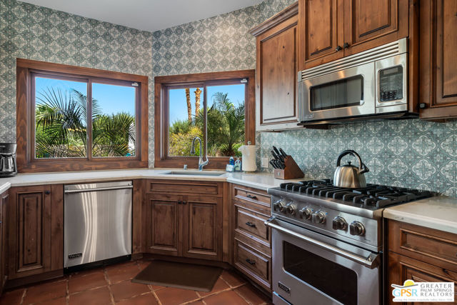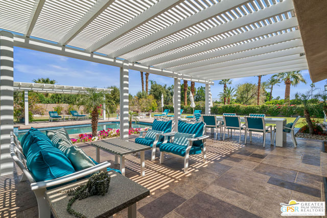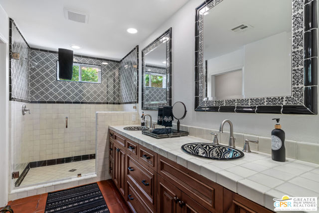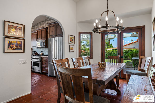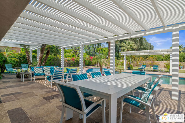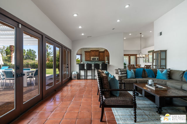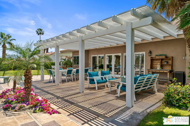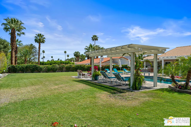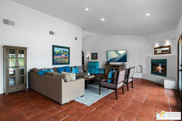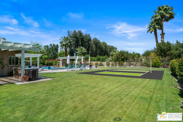 If you've been looking for a home with incredible outdoor space in the rancho Mirage Palm Desert area, this is it! This 4 bedroom 4 bath home is a hidden gem. Located in Rancho Mirage right adjacent to Palm Desert, this property has the outdoor space dreams are made of. Start off with a beautiful pool and spa which has recently been refurbished with new tile and plaster. Large outdoor covered living/dining area, new fire pit conversation area, Built-in outdoor barbecue for your cooking needs, and a massive lawn ready for you to enjoy as it is, or build your own pickleball paradise or sports court...it's not even a tight fit! The home is beautifully finished with a modern Spanish theme. 6 Custom French doors lead to the yard. The home has refinished Spanish tile floors throughout. Custom bathroom vanities and artistic tile and sinks in each bathroom. Completely custom kitchen with new cabinetry, quartz counters with a custom tile full backsplash and top of the line stainless steel appliances. Fireplaces in the Primary bedroom as well as the living room. 3 FULL SIZED garage spaces and large driveway will accommodate your fleet of vehicles. The home has 2 complete sets of washer/dryers. Keep cool with a whole house AC system, additionally, the 2 Primary bedrooms have their own mini-split AC/heaters. OWNED SOLAR will save you money as well. If you are looking to create a family compound (2 homes), please see the listing at 72218 Barbara which is also available for sale and adjacent. No HOA, You own the land!