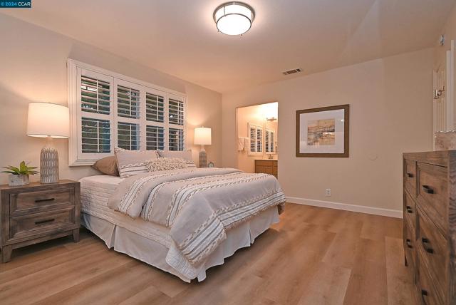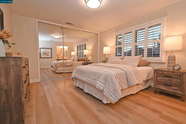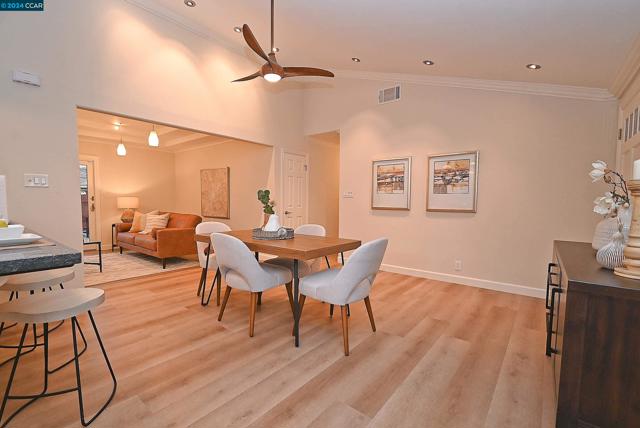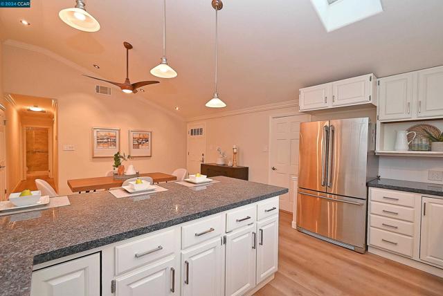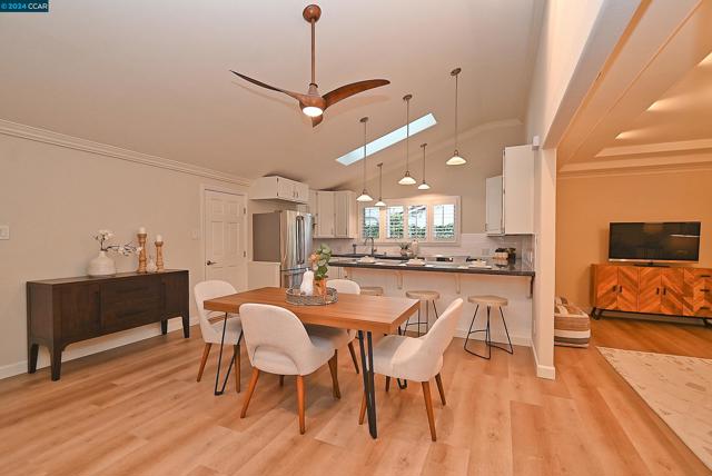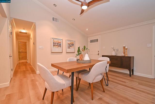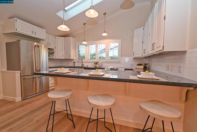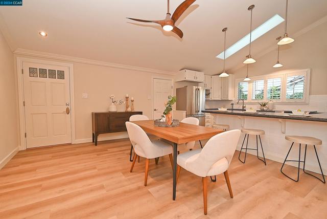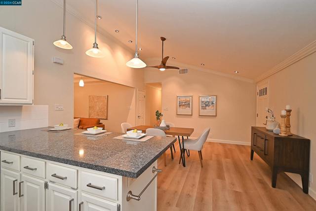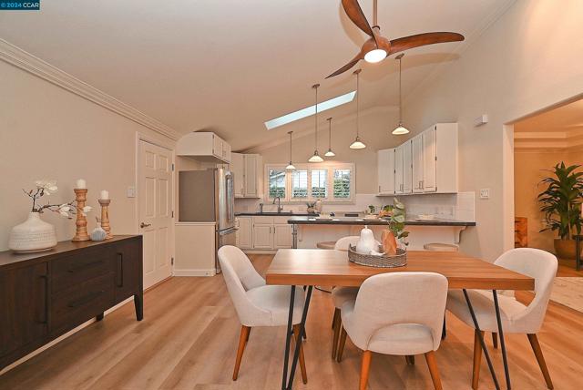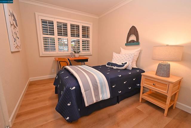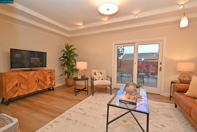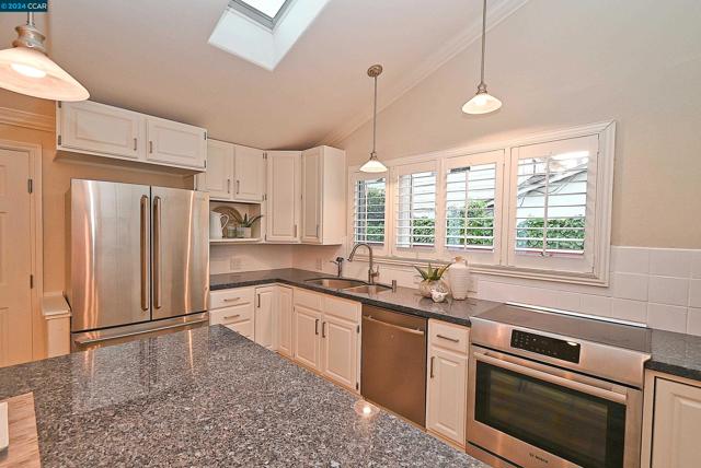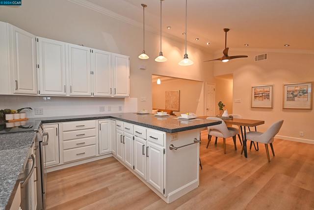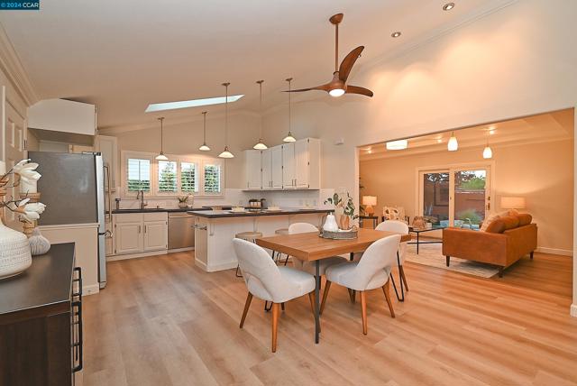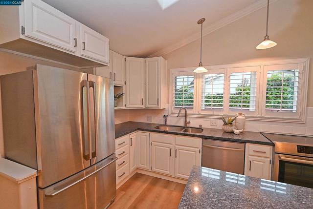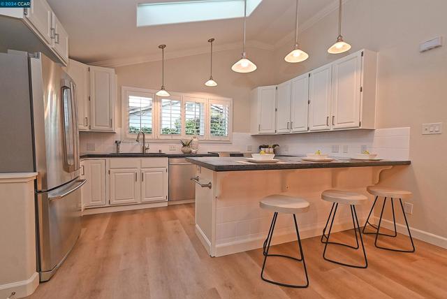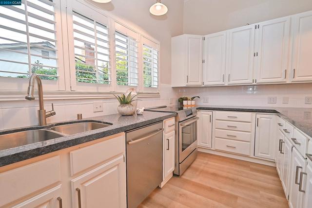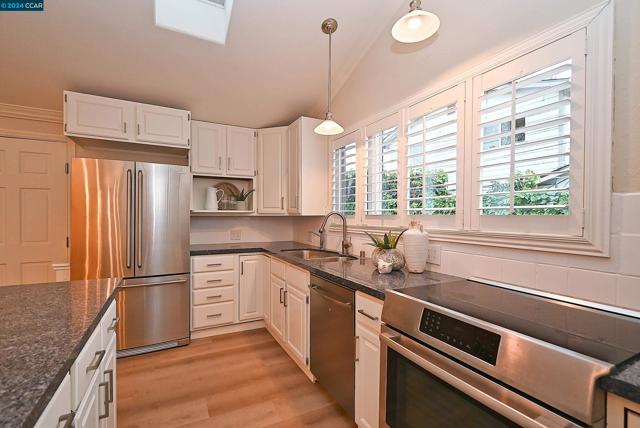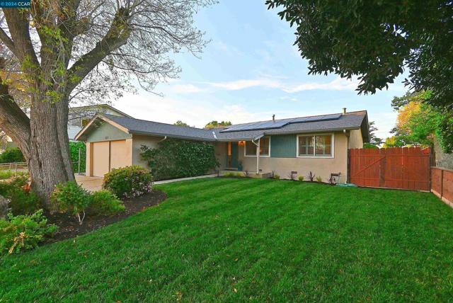 You will love this fabulous three-bedroom single story home with updates throughout! Open floor plan with coffered ceilings in living room add to the spacious feeling of this home. Kitchen features a Velux sky light, Bosch induction range, white cabinetry and blue pearl granite countertops. Dining area has vaulted ceilings and is open to the kitchen and living room, creating a great room feel for the heart of the home activity. Fabulous vinyl plank flooring throughout the home for easy care living, fresh interior and exterior paint, plantations shutters and updated lighting. Solar electric system, dual pane windows and new Owens Corning Tru-Cool composition shingle roof provide energy efficiency to minimize your utility bills. Gorgeous backyard landscaping is showcased by mature Japanese maple trees, specialty rock and paver stone patios. Newly installed front landscaping with sod and flowering plants creates a lush inviting curb appeal. The garage has been shortened to create an interior laundry and utility room. Currently the garage may only be large enough for a very small vehicle, but there is space to park 2 or 3 vehicles in the driveway. Start packing and get ready to move, you will fall in love at first sight!