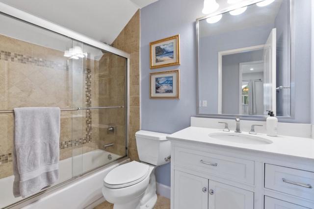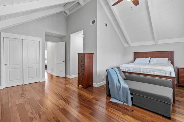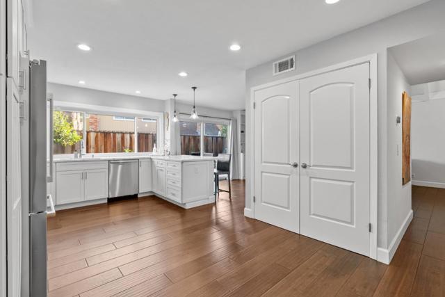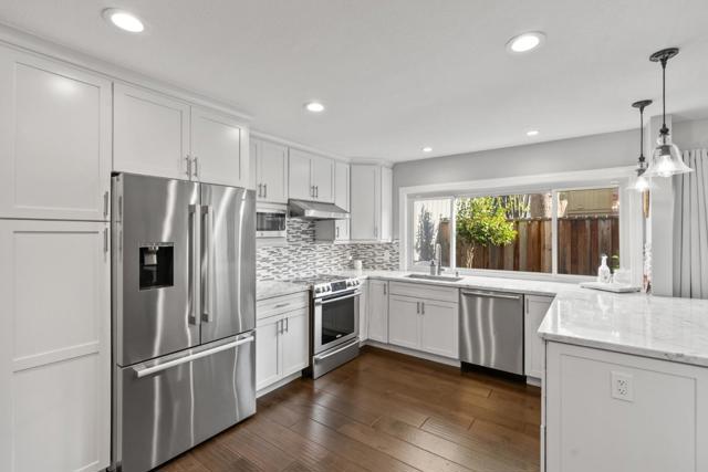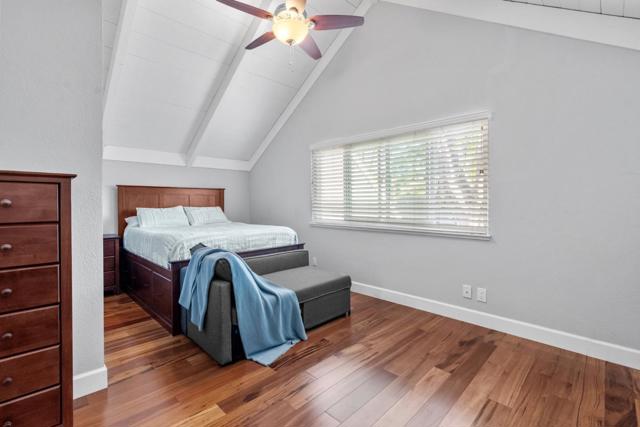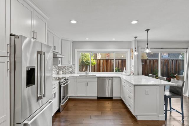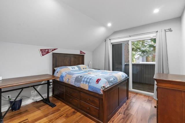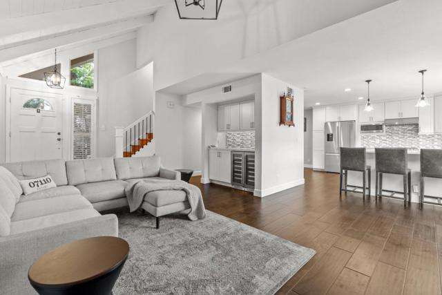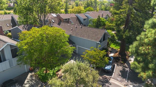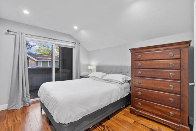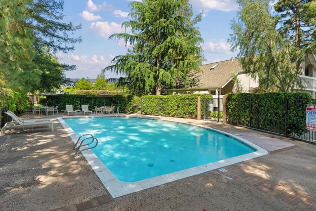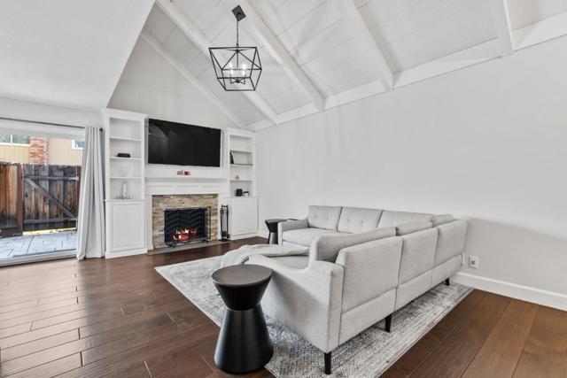 This stunning end-unit TH, nestled within the highly sought-after Los Gatos Woods Community, offers a blend of modern elegance & functional comfort. As you step inside, you're greeted by an inviting open floor plan illuminated by tons of natural light & exposed beam vaulted ceilings. The LR exudes warmth w/ its cozy wood-burning fireplace, complemented by custom built-in shelving & a dry bar equipped w/ 2 wine fridges. Vibrant hardwood flooring flows seamlessly from the living space to the beautifully updated kitchen/dining combo, where marble counters, SS appliances, ample cabinetry & a pantry boast style & convenience. Sliding glass doors effortlessly connect the indoor living space & outdoor patio - perfect for entertaining. A laundry closet & half bath complete the main level, while upstairs, Brazilian Koa hardwood floors guide you to the luxurious primary bedroom w/ its own ensuite bath, two add'l bdrms w/ vaulted ceilings & an updated guest bath. Enjoy the amenities of central HVAC & an attached 2-car garage w/ Tesla EV charger. The Los Gatos Woods Community offers an array of amenities, including 2 pools, basketball/volleyball/tennis courts, a gym, playground & clubhouse. With top-rated schools, this property is your opportunity to experience the best of Los Gatos living.
