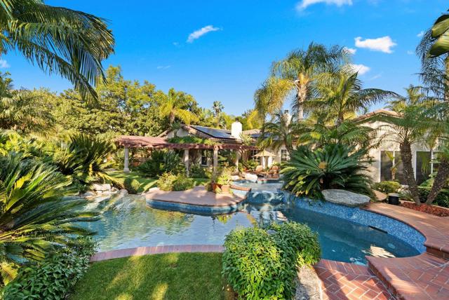 Savenna at Santa Fe Valley’s finest estate home full of timeless charm and modern features! This stunning single-level home boasts 5 bedrooms, 5.5 bathrooms, an office, a billiard room, and a 4-car customized garage. This premier corner lot at 0.7 acres was recognized by San Diego Home and Garden Magazine for its pool and landscape design making it a true oasis filled with lush mature landscaping. The fully fenced terrestrial paradise features waterfalls, a gazebo for relaxing, tranquil gardens, a fire pit, and a covered outdoor kitchen. The marquee of this home is the kitchen that opens to your entertainment area, making it the perfect space for hosting guests and family. The kitchen features newer solid Cherry wood cabinets, adding to the timeless elegance of this property. No home is complete without smart amenities including a fully owned 72-panel solar system, Tesla power wall, Hydrawise irrigation system, audiophile-grade sound throughout, video surveillance system, newer wifi-controlled HVAC system, and more! This is the most prestigious estate home for anyone seeking a peaceful and serene lifestyle.