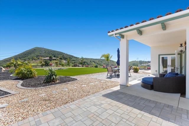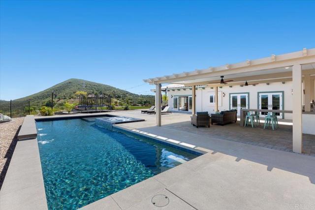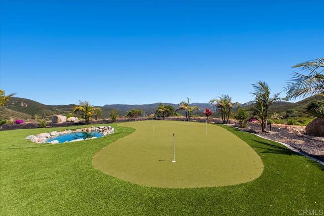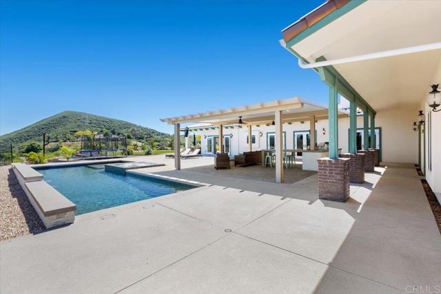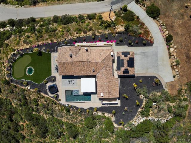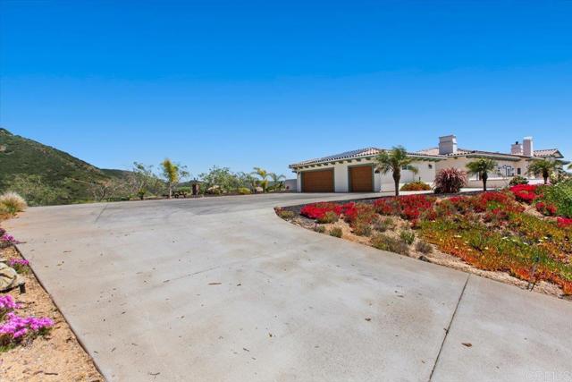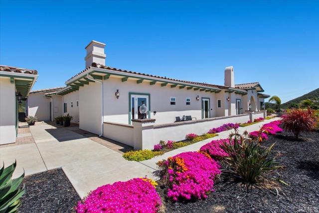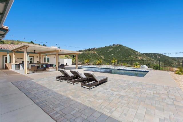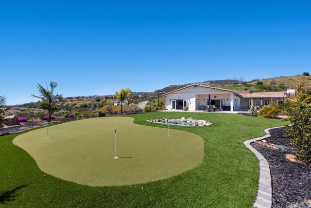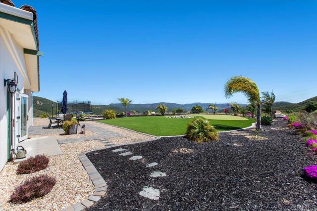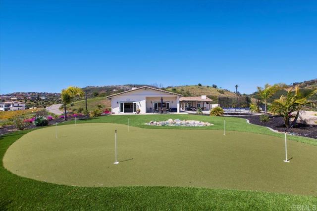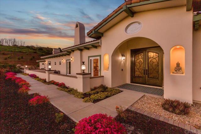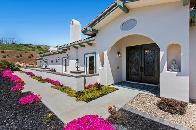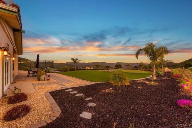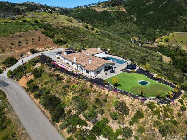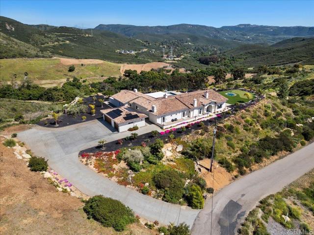 Welcome to this exclusive gem in San Marcos! This stunning custom-built home is where luxury meets countryside charm, offering fantastic forever views. Situated on over 9 acres of land, this single-level oasis offers a rare blend of rural tranquility and modern convenience. Rarely can you find a custom, newer construction home tucked into the hills of San Marcos offering such a serene country feeling, yet so close to everything North County has to offer. You will be impressed with the outdoor amenities, where the owners have meticulously thought of every detail to create an entertainer’s dream! Picture yourself perfecting your putting game on the large green, lounging by the sparkling pool and spa, or hosting unforgettable gatherings at the spacious BBQ island and built-in firepit, all while enjoying your picturesque mountain views. Step inside to discover a thoughtfully designed floorplan that seamlessly combines comfort and elegance. With 4 bedrooms, including 3 with ensuite baths, everyone can enjoy their own private retreat. A generous bonus room, complete with its own fireplace, provides the ideal space for entertainment or relaxation. Need a quiet place to work? The dedicated office offers the perfect solution. Every detail of this home has been carefully curated, from the hardwood floors and crown molding to the custom gourmet kitchen featuring stainless steel appliances, stone counters, and soaring ceilings. And with a 10.05 KWP solar system, you can enjoy energy efficiency and peace of mind for years to come. You will appreciate the parking spaces: 3 car garage and spacious private driveway. There’s even a private orchard with over 60 fruit trees, including avocado, apples, oranges, peaches, mandarin mangoes, and nectarines, providing a bounty of fresh produce right at your fingertips. Welcome Home! This is an oversized lot with wonderful potential...Explore the possibilities of including your own horse facility/stables and the potential addition of an ADU or other structure (see property aerial boundary map) . Just a short drive to San Elijo Hills, schools, shopping and restaurants, and close to Carlsbad/Encinitas beaches and surfing. No HOA/No Melloroos!