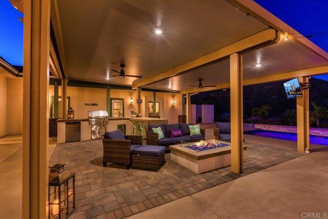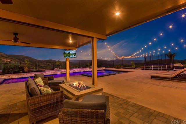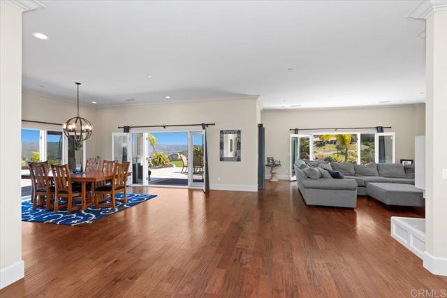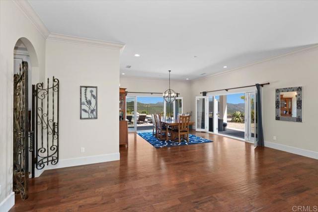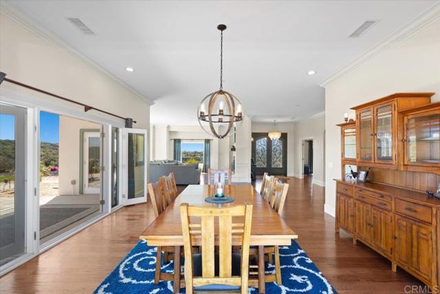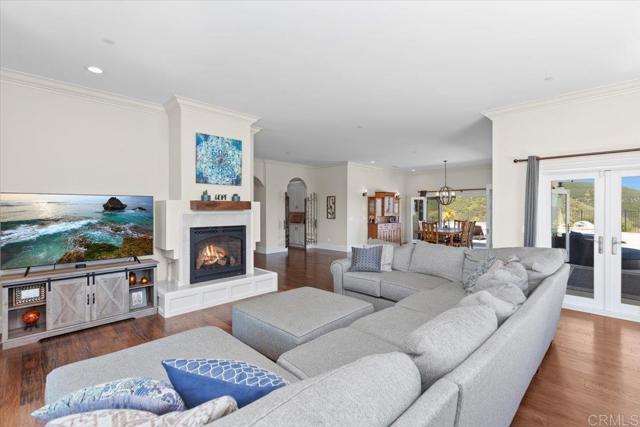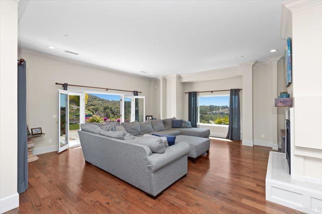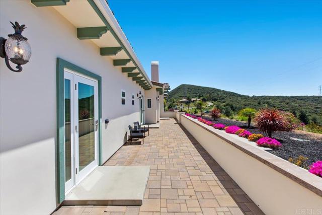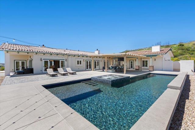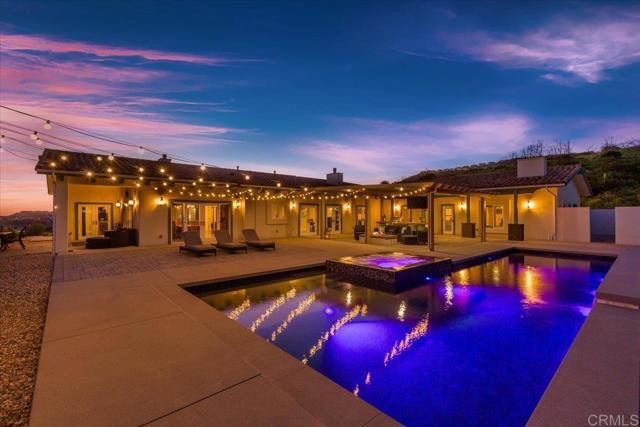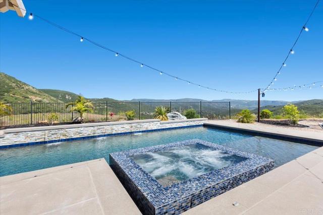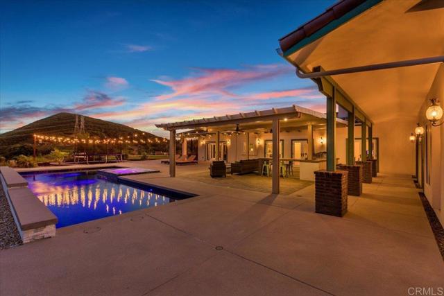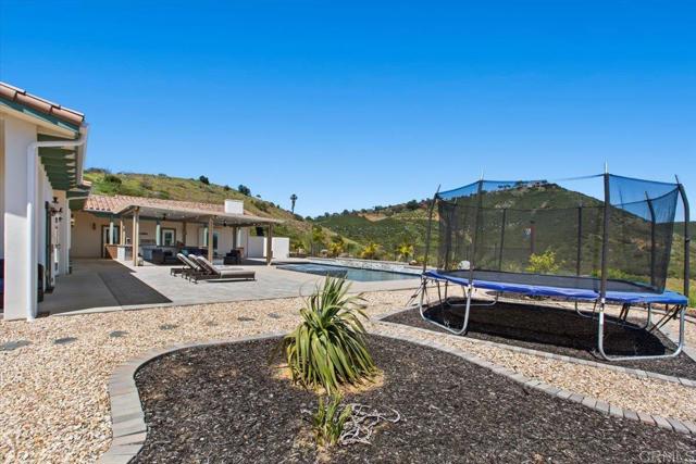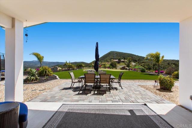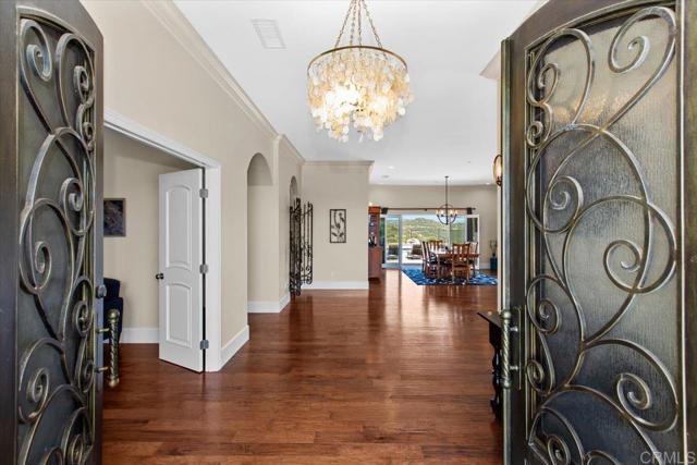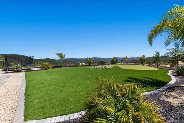 Welcome to this exclusive gem in San Marcos! This stunning custom-built home is where luxury meets countryside charm, offering fantastic forever views. Situated on over 9 acres of land, this single-level oasis offers a rare blend of rural tranquility and modern convenience. Rarely can you find a custom, newer construction home tucked into the hills of San Marcos offering such a serene country feeling, yet so close to everything North County has to offer. You will be impressed with the outdoor amenities, where the owners have meticulously thought of every detail to create an entertainer’s dream! Picture yourself perfecting your putting game on the large green, lounging by the sparkling pool and spa, or hosting unforgettable gatherings at the spacious BBQ island and built-in firepit, all while enjoying your picturesque mountain views. Step inside to discover a thoughtfully designed floorplan that seamlessly combines comfort and elegance. With 4 bedrooms, including 3 with ensuite baths, everyone can enjoy their own private retreat. A generous bonus room, complete with its own fireplace, provides the ideal space for entertainment or relaxation. Need a quiet place to work? The dedicated office offers the perfect solution. Every detail of this home has been carefully curated, from the hardwood floors and crown molding to the custom gourmet kitchen featuring stainless steel appliances, stone counters, and soaring ceilings. And with a 10.05 KWP solar system, you can enjoy energy efficiency and peace of mind for years to come. You will appreciate the parking spaces: 3 car garage and spacious private driveway. There’s even a private orchard with over 60 fruit trees, including avocado, apples, oranges, peaches, mandarin mangoes, and nectarines, providing a bounty of fresh produce right at your fingertips. Welcome Home! This is an oversized lot with wonderful potential...Explore the possibilities of including your own horse facility/stables and the potential addition of an ADU or other structure (see property aerial boundary map) . Just a short drive to San Elijo Hills, schools, shopping and restaurants, and close to Carlsbad/Encinitas beaches and surfing. No HOA/No Melloroos!