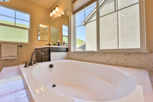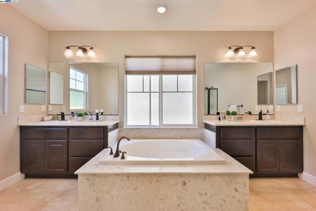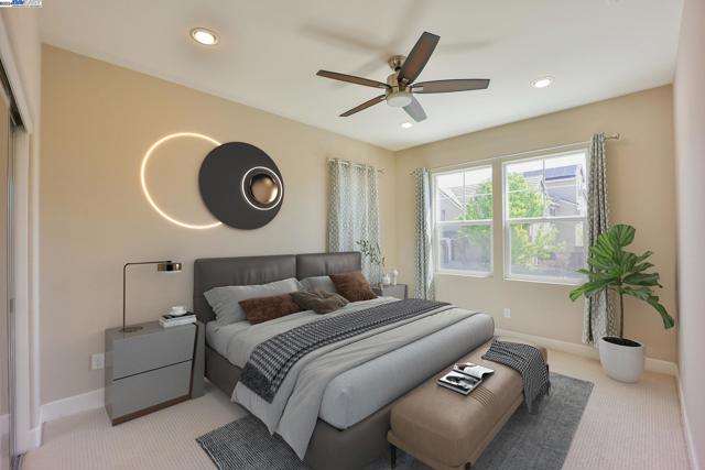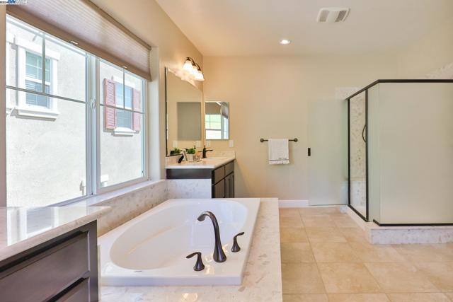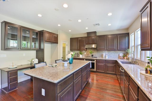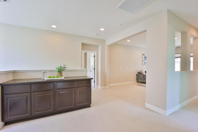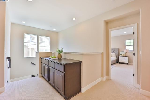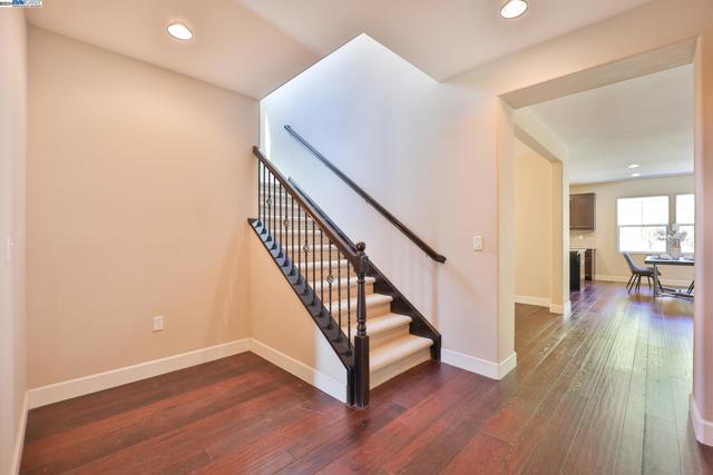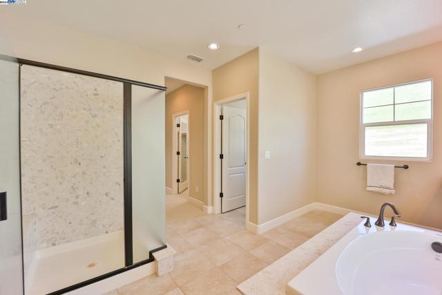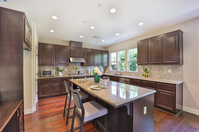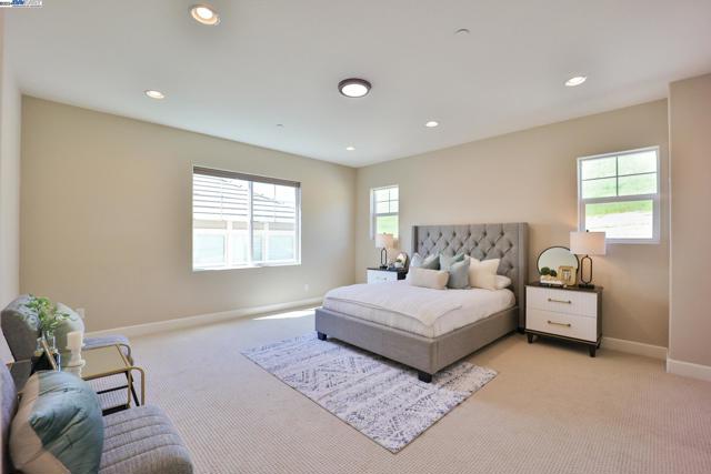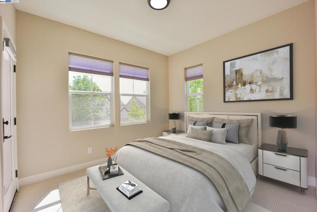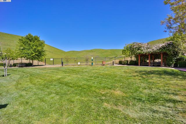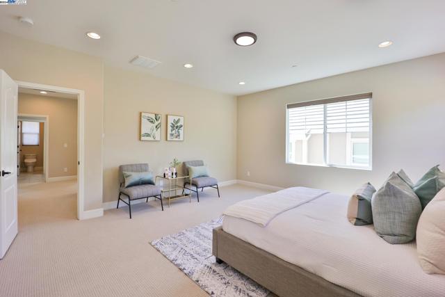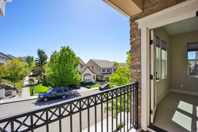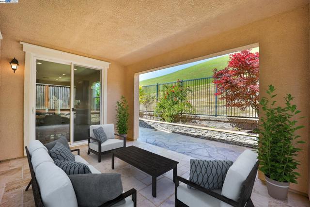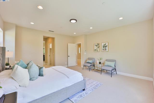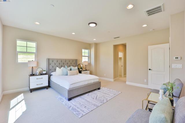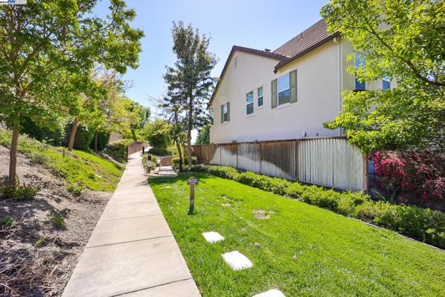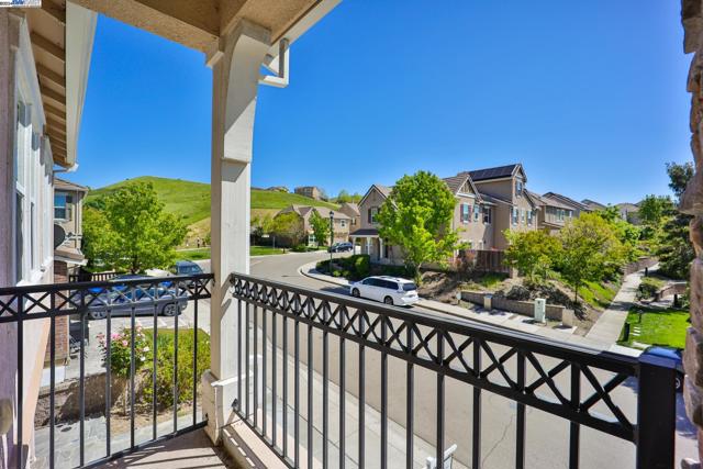 Executive Home in highly desirable Chateau at Fallon Crossing. This upgraded newer construction home is located on a premium lot with no rear neighbors and with beautiful rolling hills in the backdrop. This home features high ceiling throughout, open floorplan with formal dining area, gourmet kitchen with large center island, granite counters, upgraded stainless steel appliances, and rich maple cabinets. Huge family/great room concept overlook private backyard with covered outdoor sitting area paved with travertine tiles. Wonderful floorplan with one bedroom and full bath on ground level. Upstairs features primary bedroom suite with luxury bathroom including walk-in closet, separate sunken tub, stove shower, and dual vanities. There is also a spacious and cozy loft perfect for home office, home theater, or just another gather spot. Upgrades in this home includes rich plank hardwood flooring throughout the entire ground level, new designer patterned carpet throughout 2nd level, recessed lighting, ceiling fans, owned 21-solar panels with 2 Tesla backup batteries, level 2 EVcharger, water softener, central A/C & heating. Excellent location with easy access to award winning Dublin Schools, shopping, parks, shopping, and restaurants. Immaculate move-in ready condition.