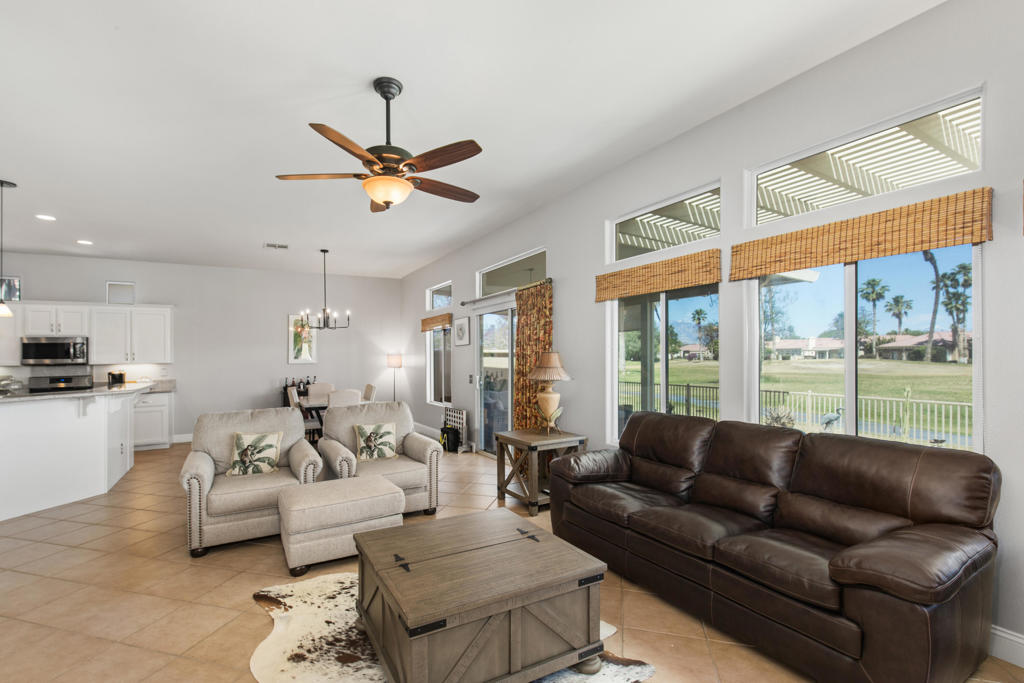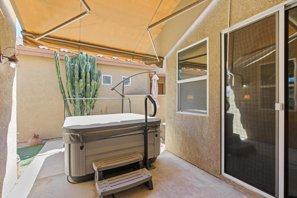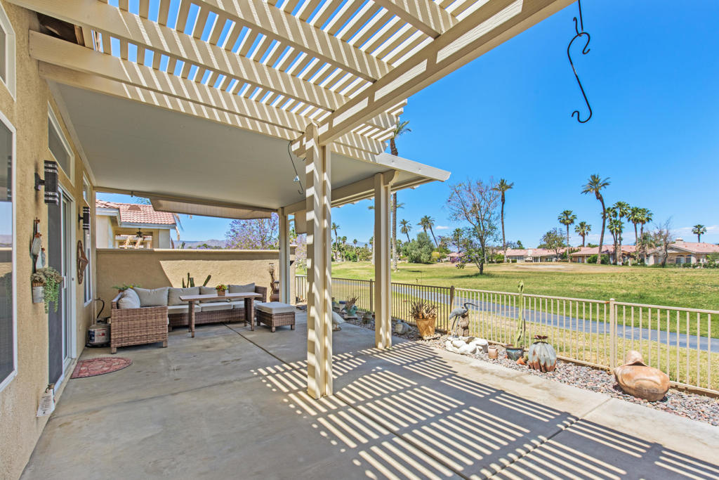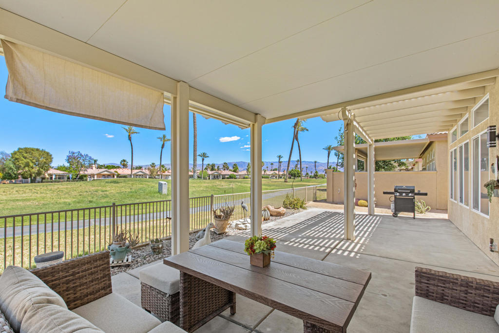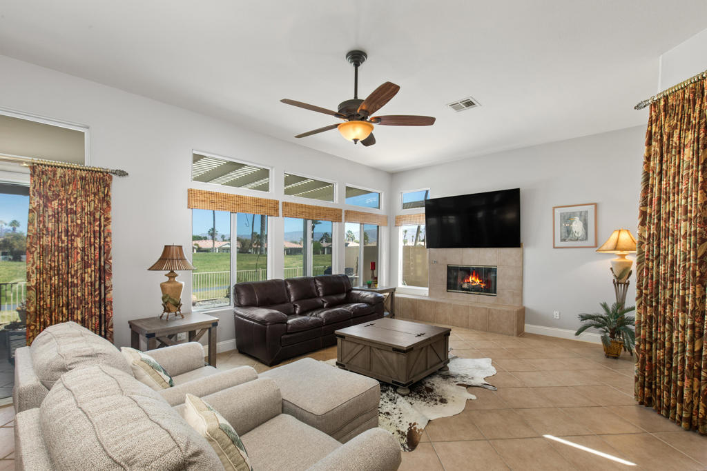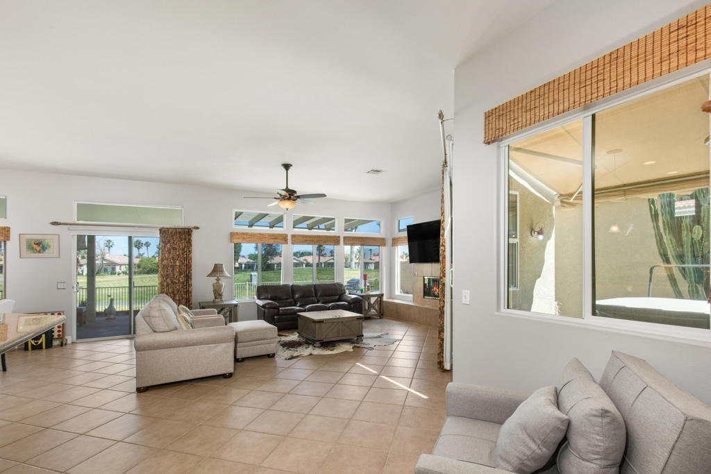 Stylishly updated, turnkey furnished home with lovely golf course views. Situated in guard-gated Indian Palm Country Club, this open floor plan home exudes casual comfort. Once inside the glass inlaid double door entry, the foyer and main living areas have oversized diagonal tile floors, with rich laminate in the bedrooms for easy cleaning. Plenty of counter space and newer stainless steel appliances and gas range make for easy entertaining. The spacious great room with fireplace and adjoining kitchen opens onto the patio with views of the 4th hole of the Mountain Course, accentuated by transom windows. Direct access from the living room and primary bedroom to a roomy above ground hot tub in a private courtyard. The third bedroom also has a sitting area / office that could also be used as an overflow sleeping area. Outside the back patio has one portion of the patio fully covered with sun shades and the other with a partial easy maintenance aluma-wood type cover; perfect for all weather. This space has endless possibilities. Indian Palms offers 27 holes of golf. The course and clubhouse is open to the public. This HOA includes membership to the Lifestyle Center, which includes a large pool, gym, bocce ball, tennis and pickleball. Indian Palms also has a boutique hotel and is also located close to the Polo grounds, which hosts the popular Coachella and Stagecoach festivals. This particular HOA allows short term rentals too!