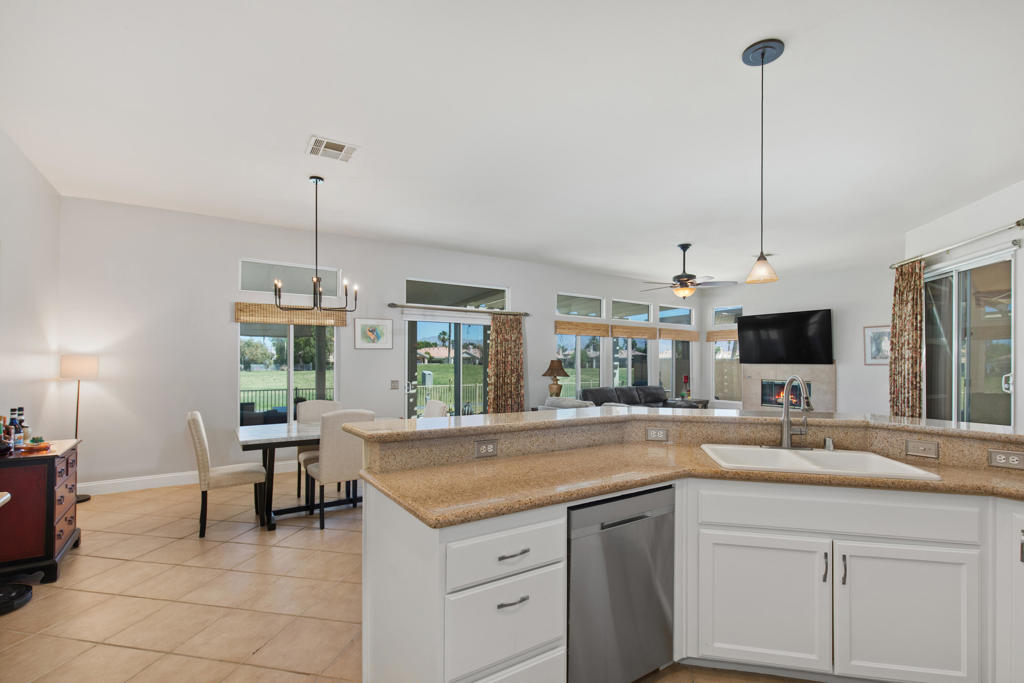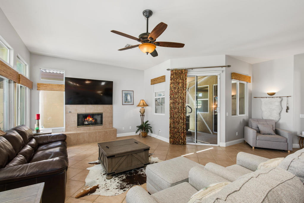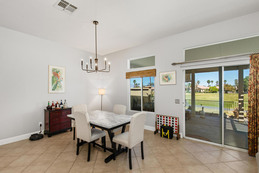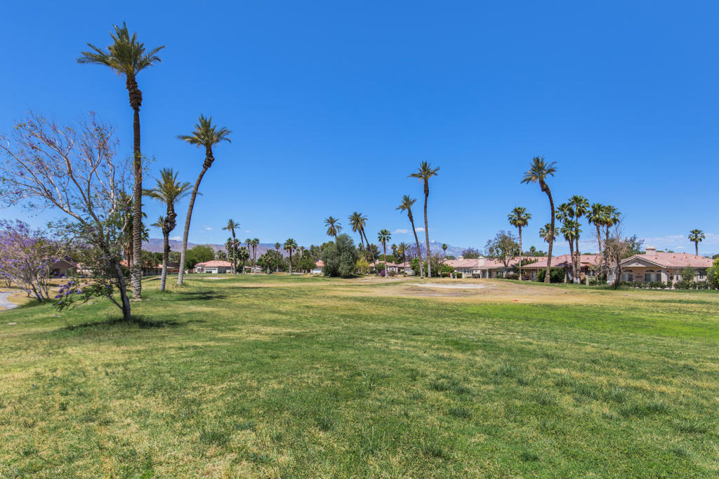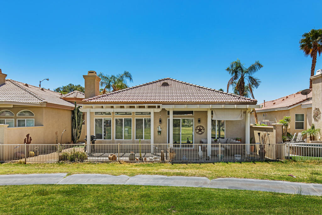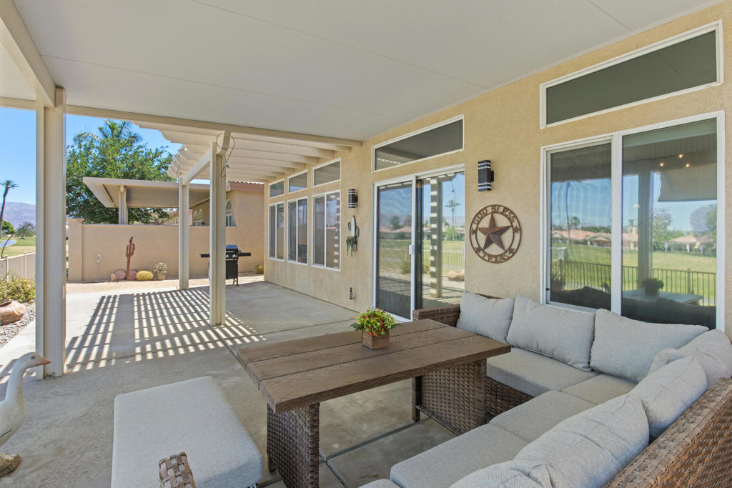 Stylishly updated, turnkey furnished home with lovely golf course views. Situated in guard-gated Indian Palm Country Club, this open floor plan home exudes casual comfort. Once inside the glass inlaid double door entry, the foyer and main living areas have oversized diagonal tile floors, with rich laminate in the bedrooms for easy cleaning. Plenty of counter space and newer stainless steel appliances and gas range make for easy entertaining. The spacious great room with fireplace and adjoining kitchen opens onto the patio with views of the 4th hole of the Mountain Course, accentuated by transom windows. Direct access from the living room and primary bedroom to a roomy above ground hot tub in a private courtyard. The third bedroom also has a sitting area / office that could also be used as an overflow sleeping area. Outside the back patio has one portion of the patio fully covered with sun shades and the other with a partial easy maintenance aluma-wood type cover; perfect for all weather. This space has endless possibilities. Indian Palms offers 27 holes of golf. The course and clubhouse is open to the public. This HOA includes membership to the Lifestyle Center, which includes a large pool, gym, bocce ball, tennis and pickleball. Indian Palms also has a boutique hotel and is also located close to the Polo grounds, which hosts the popular Coachella and Stagecoach festivals. This particular HOA allows short term rentals too!