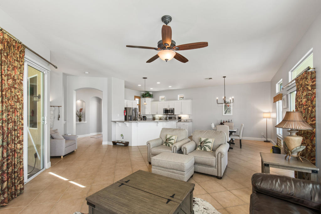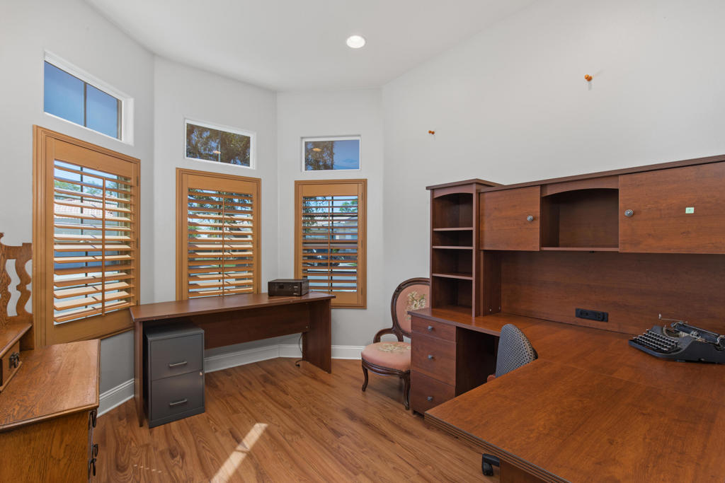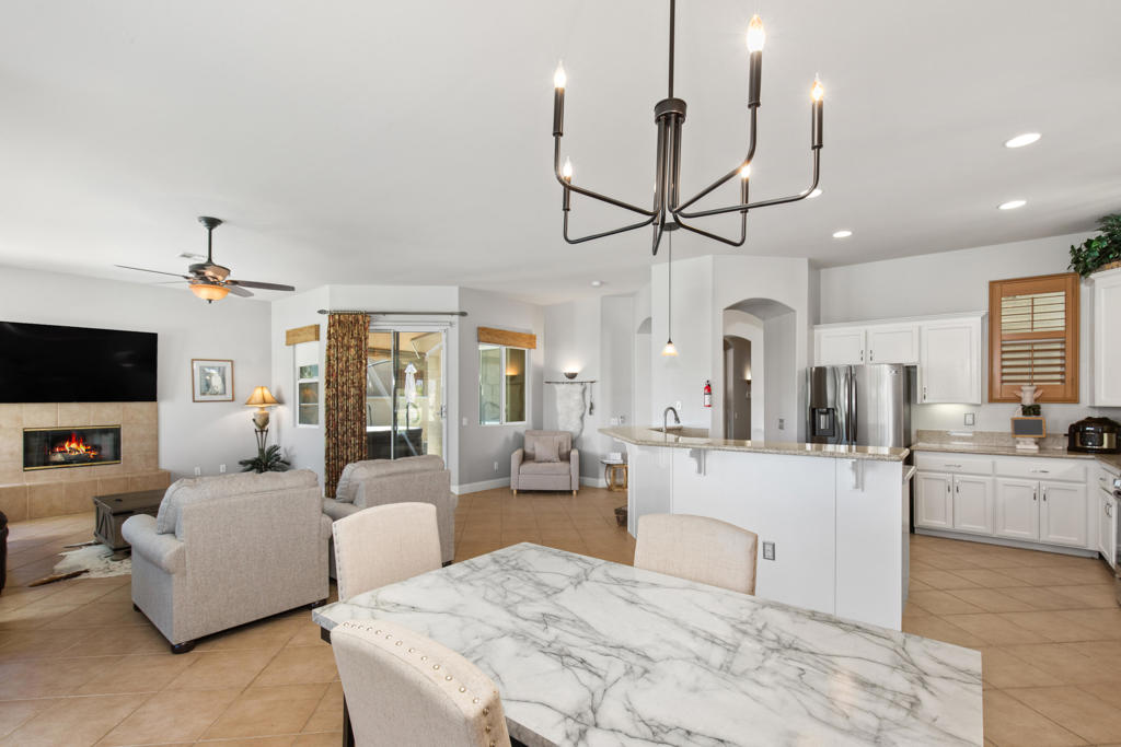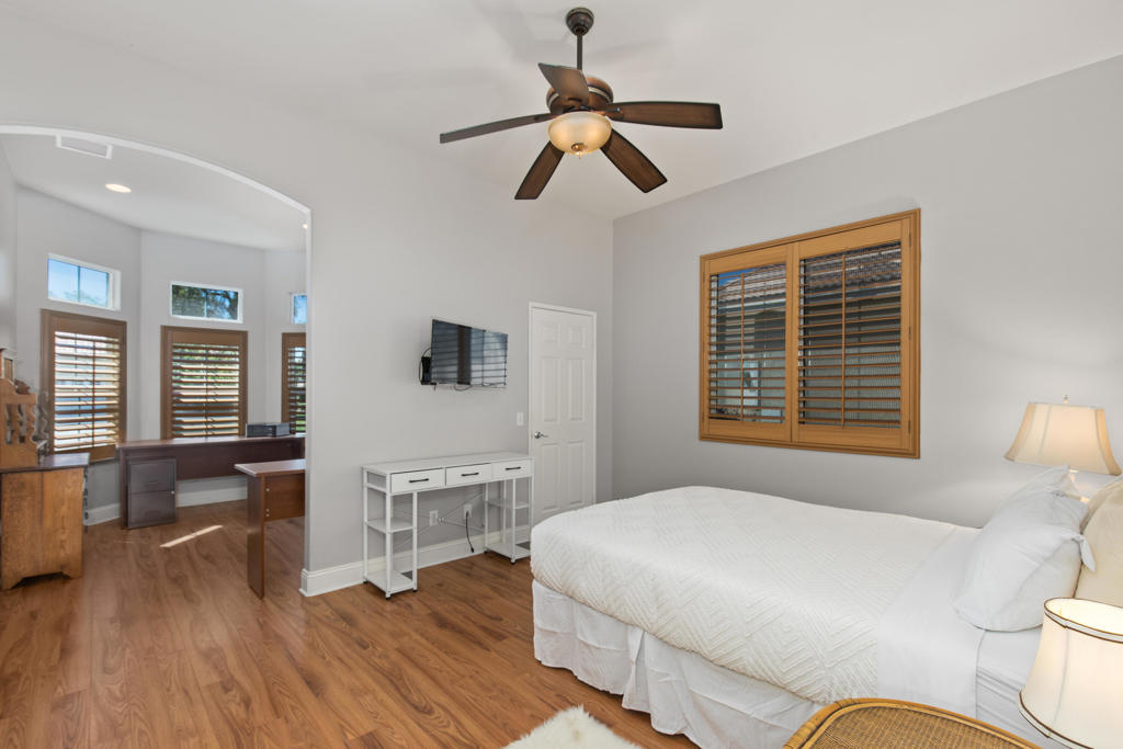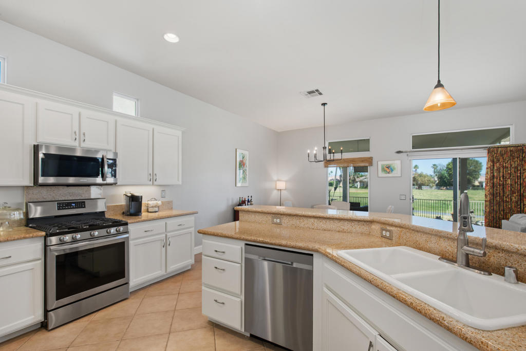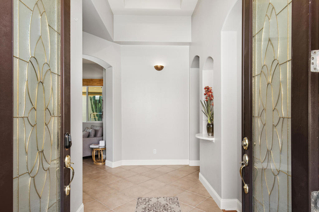 Stylishly updated, turnkey furnished home with lovely golf course views. Situated in guard-gated Indian Palm Country Club, this open floor plan home exudes casual comfort. Once inside the glass inlaid double door entry, the foyer and main living areas have oversized diagonal tile floors, with rich laminate in the bedrooms for easy cleaning. Plenty of counter space and newer stainless steel appliances and gas range make for easy entertaining. The spacious great room with fireplace and adjoining kitchen opens onto the patio with views of the 4th hole of the Mountain Course, accentuated by transom windows. Direct access from the living room and primary bedroom to a roomy above ground hot tub in a private courtyard. The third bedroom also has a sitting area / office that could also be used as an overflow sleeping area. Outside the back patio has one portion of the patio fully covered with sun shades and the other with a partial easy maintenance aluma-wood type cover; perfect for all weather. This space has endless possibilities. Indian Palms offers 27 holes of golf. The course and clubhouse is open to the public. This HOA includes membership to the Lifestyle Center, which includes a large pool, gym, bocce ball, tennis and pickleball. Indian Palms also has a boutique hotel and is also located close to the Polo grounds, which hosts the popular Coachella and Stagecoach festivals. This particular HOA allows short term rentals too!