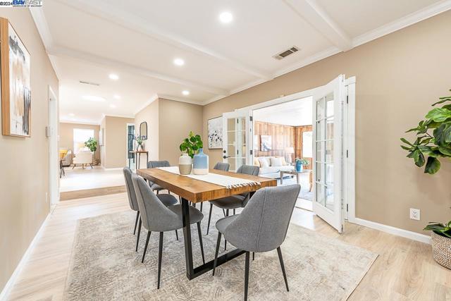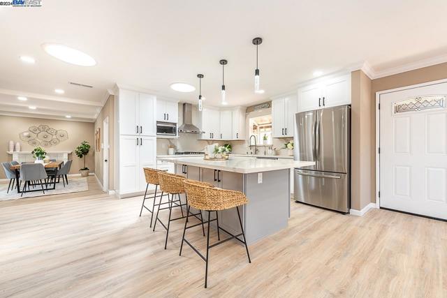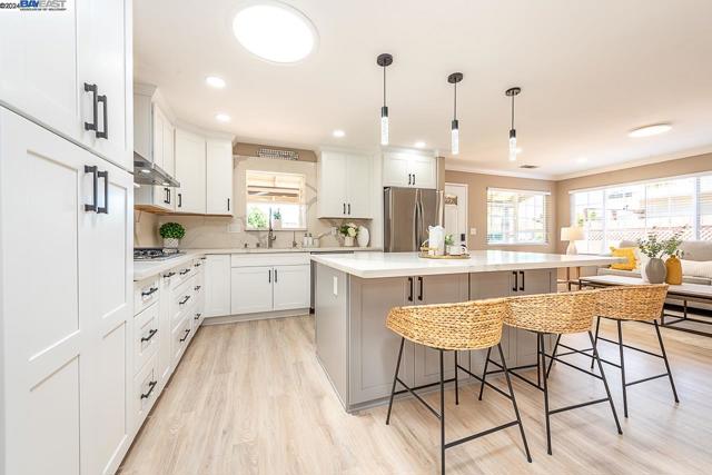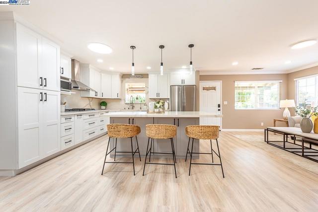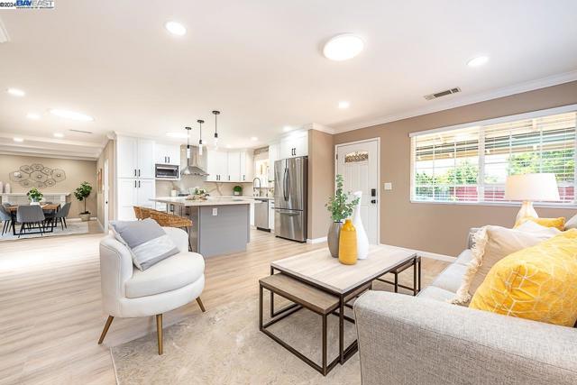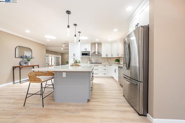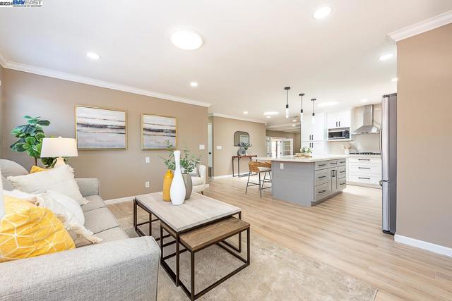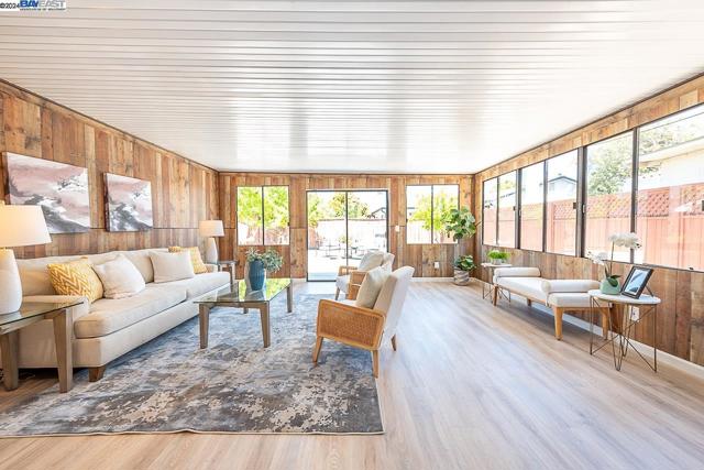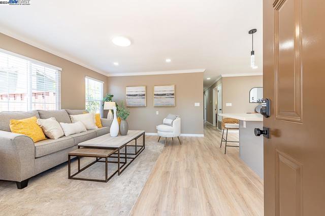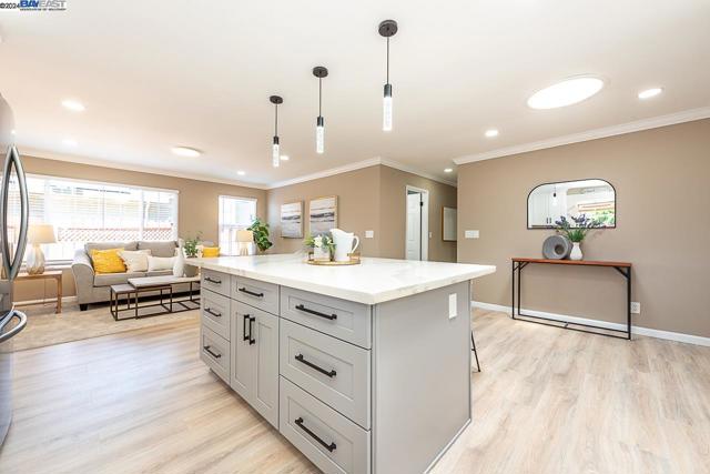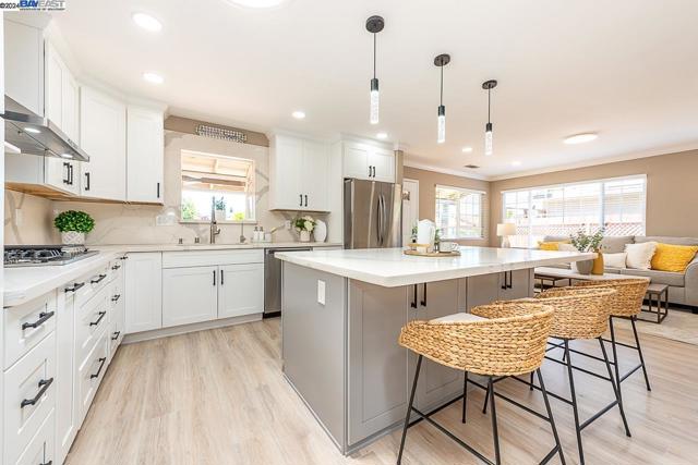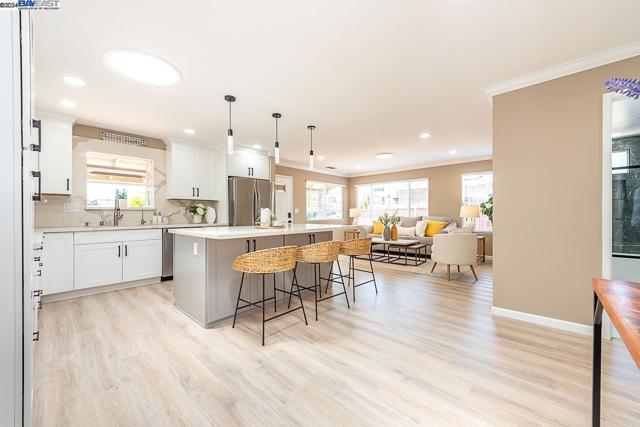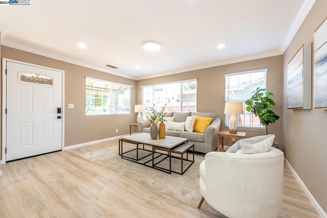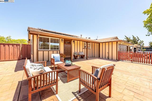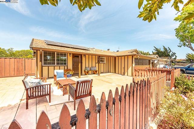 Welcome to this stunning home offering contemporary, open-concept living. Newly remodeled with impressive upgrades and high-end finishes including fully paid solar. Walk through your large front yard enclosed with a private patio so you can enjoy the outdoors. The formal living room opens to the fully remodeled kitchen. A new gourmet kitchen offering a huge island with pendant lighting, Quartz counters with full-height backsplash and new stainless steel appliances with a gas stove. The formal dining area has french doors leading to the patio room which offers even more living space. Spacious bedrooms and fully remodeled bathrooms with custom finishes. A large, low-maintenance yard offers even more space to relax and unwind. Upgraded throughout with solar panels, new flooring and paint, smart home devices and more! Served by #1 Delaine Eastin Elementary. Great location near I-880/84/92, BART, shopping and major employers of the Bay Area.