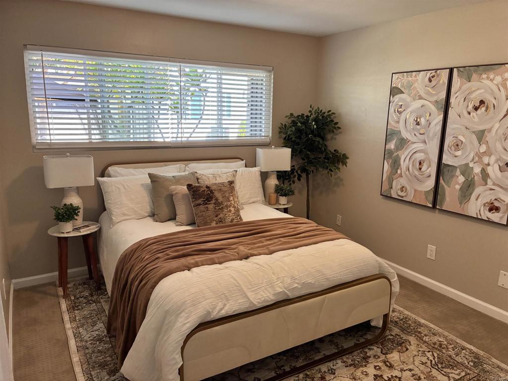 Charming One-Story Condo with Modern Comforts: Welcome to this charming single-level 2-bedroom, 1-bath condo, offering comfort, privacy, and modern updates in a convenient location. This home is thoughtfully positioned behind a beautiful privacy hedge with a green grass area right in front, creating an inviting outdoor setting before you even step inside. The interior features an open-concept living and dining area with abundant natural light, warm finishes, and a functional flow. The kitchen is equipped with granite countertops, stainless steel appliances, and a cozy dining nook perfect for everyday meals. Both bedrooms are warm and cozy, and the home includes a well-appointed bathroom and the comfort of a brand-new air conditioning system, ensuring year-round enjoyment. Additional highlights include a shared garage, community laundry, and the advantage of a one-story layout with no unit above. This property is ideal for first-time buyers, downsizers, or investors seeking a low-maintenance home with great appeal.