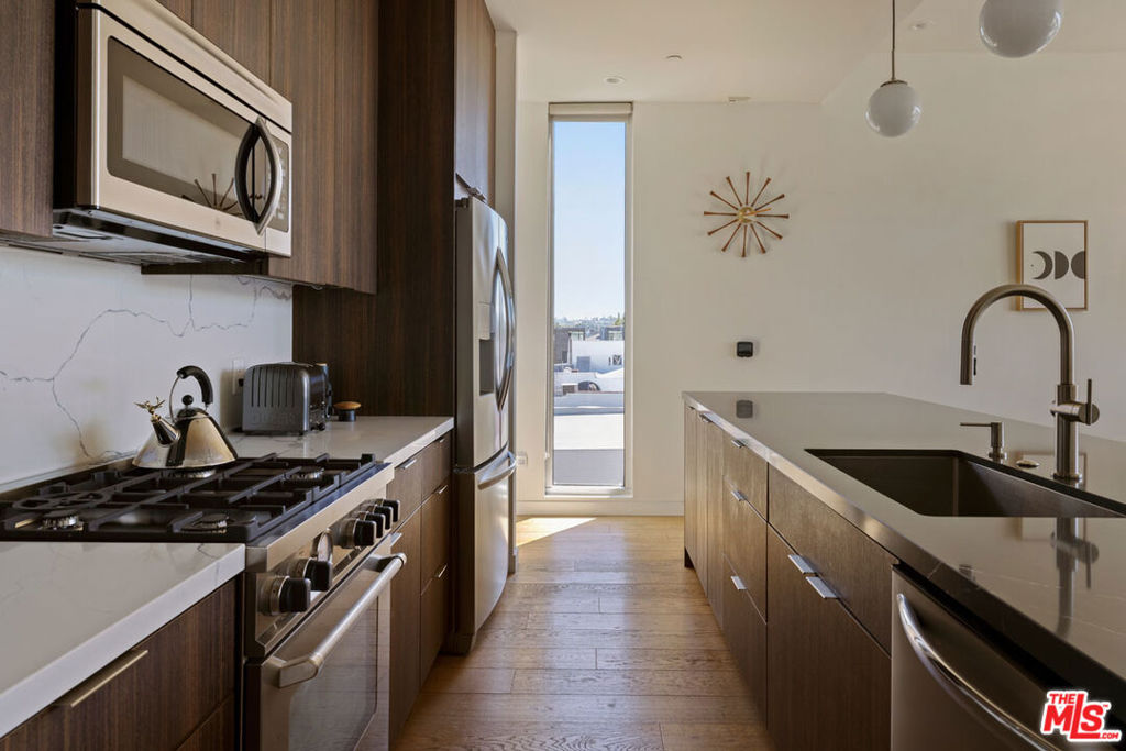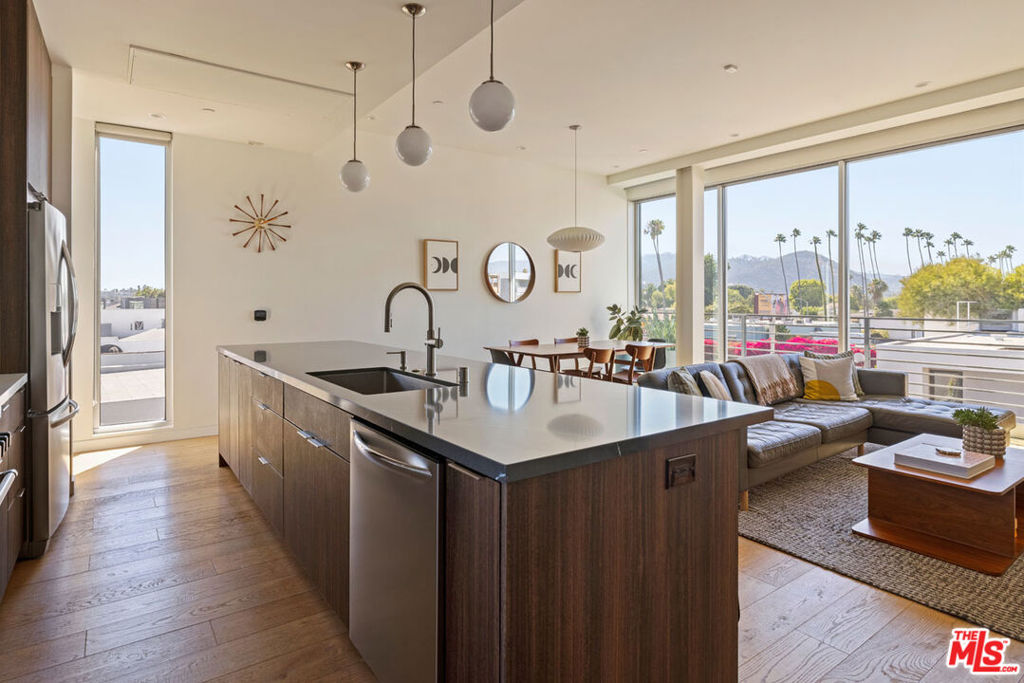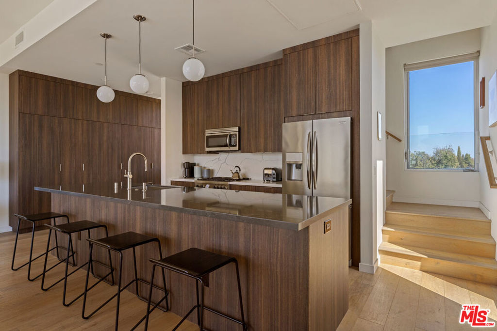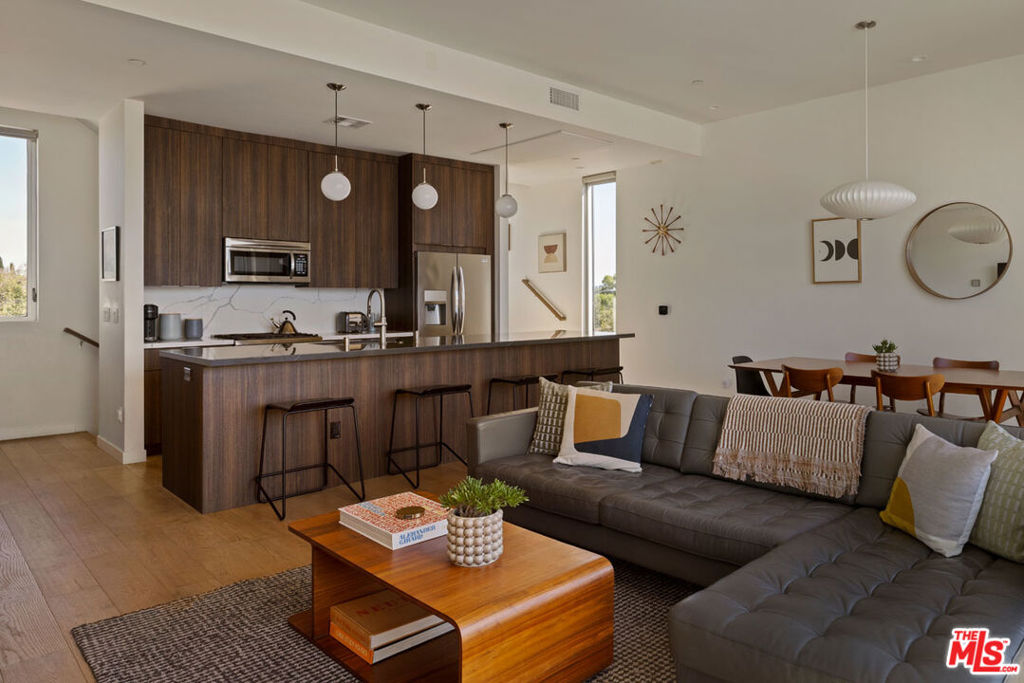 In the heart of Atwater Village, this modern four-level home by Corsini Stark Architects is a smart live/work setup with panoramic rooftop views and a prime location. A ground-level suite with a private entrance is perfect for an office, studio, or guest room, with its own bath and poured concrete floors. The upper level features an open great room with floor-to-ceiling glass, a breezy balcony, and engineered wood floors; the kitchen is a design showcase with quartz countertops, Bertazzoni appliances, and Kohler fixtures. Two bedrooms on the second level include a bright and spacious ensuite primary. The private rooftop deck is a dreamy setting for alfresco dining while enjoying the views over Griffith Park. Amenities include zoned heating and cooling, in-unit laundry, EV charger, finished two-car garage, and extra storage. Just blocks away: Proof Bakery, Dune, Morihiro, Spina, Holy Basil, and Hail Mary Pizza, plus a vibrant mix of independent shops, salons, and local markets.