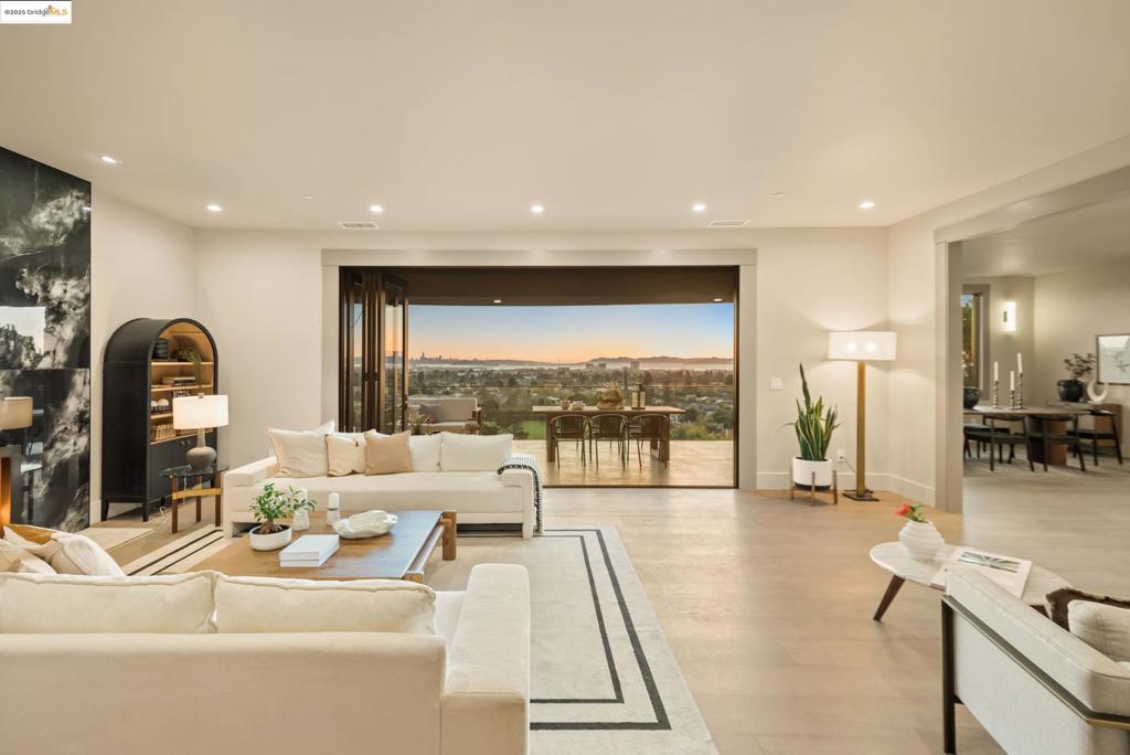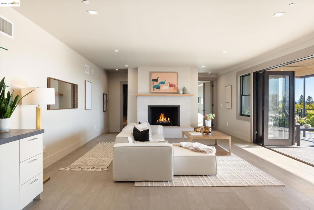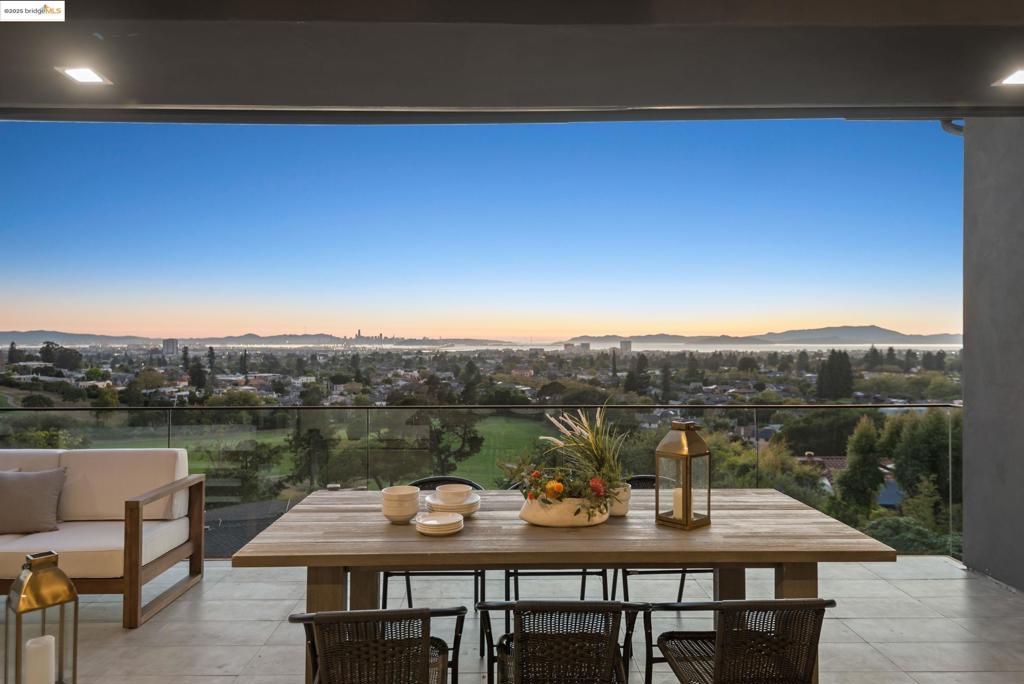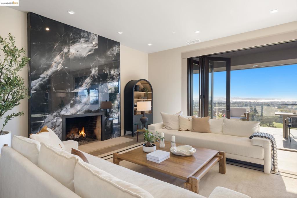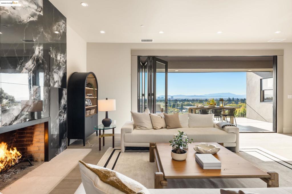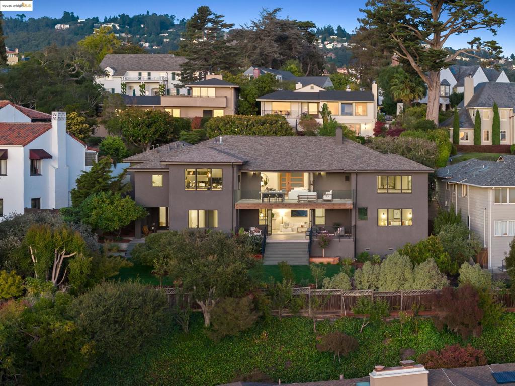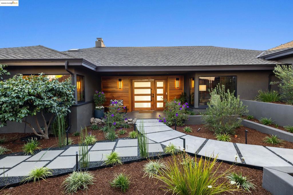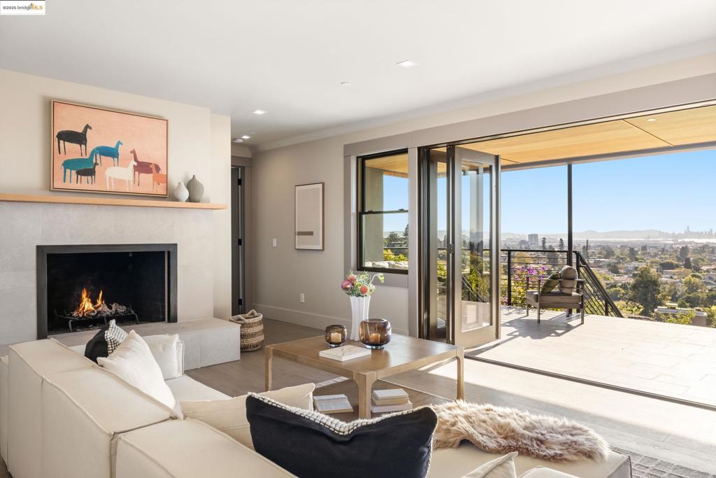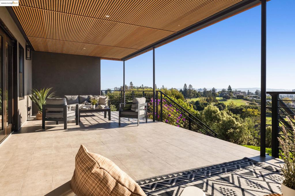 Perched in prestigious Claremont Pines, 5737 Country Club Drive is a reimagined 1952 residence that masterfully marries midcentury heritage with contemporary sophistication. Expanded and meticulously renovated, the home embraces natural light, clean lines, and sweeping views of the San Francisco Bay and skyline. A private garden entry and custom pivot door lead to the main level, where a dramatic living room with fireplace and wall-to-wall glass accordion doors open to a deck with frameless railings. At the heart of the home, the kitchen and dining room showcase a sculpted stone island with dual faucets, a bespoke coffee bar with brass sink, & a prep bar with wine fridge, and secondary dishwasher. A pantry, laundry suite, two powder rooms, garage, office, & ensuite bedroom complete the level, while the primary suite offers dual walk-in closets & a spa-inspired bath with glass rain shower, freestanding tub, custom stone vanity, water closet, & sliding doors that frame the view. The lower level features a family room with fireplace and wet bar, two ensuite bedrooms, a theater, wine cellar, flex room, & fitness space opening to landscaped gardens and a flat lawn—seamlessly blending hillside tranquility with urban connectivity for a rare fusion of architecture, setting and lifestyle.