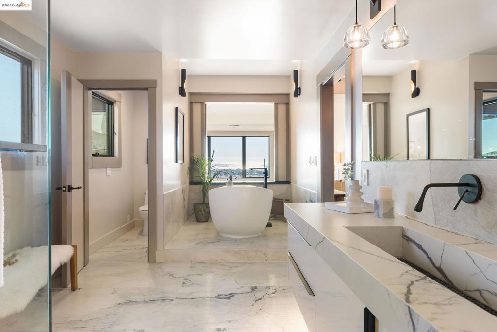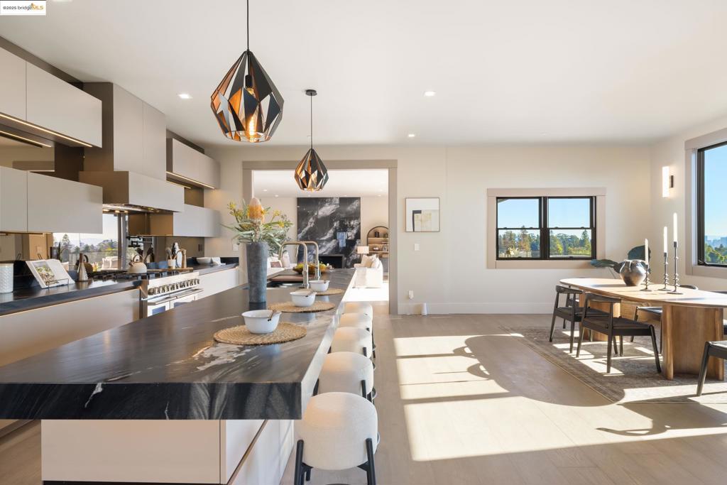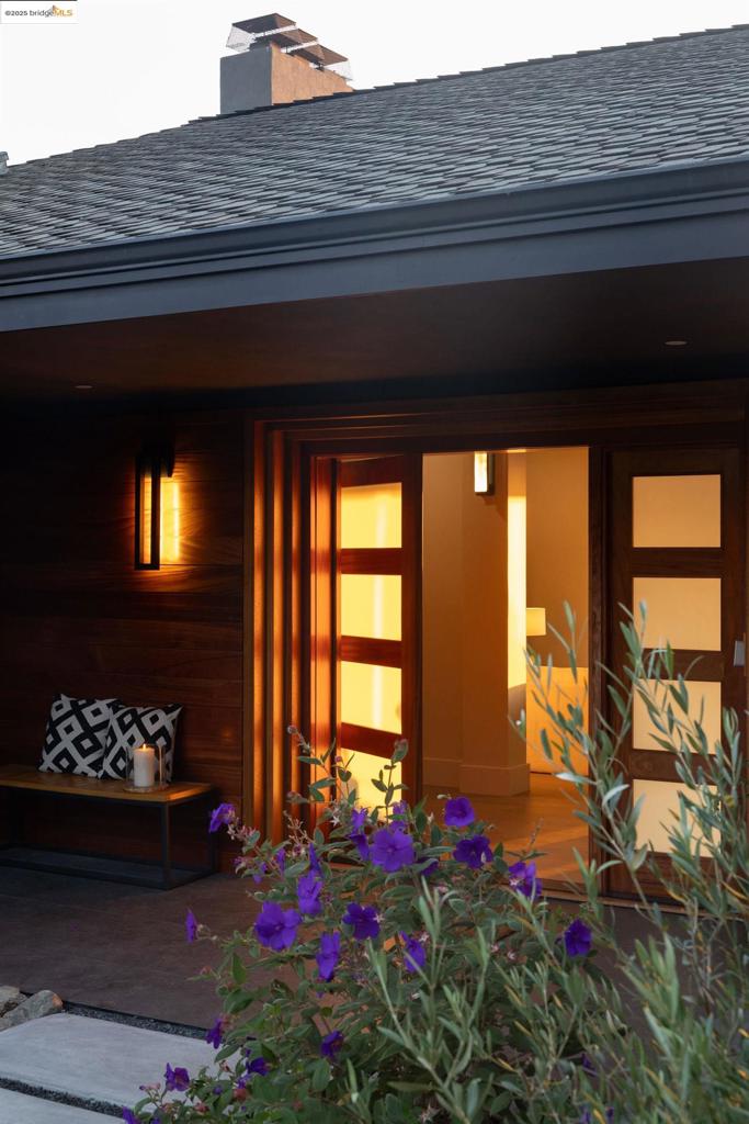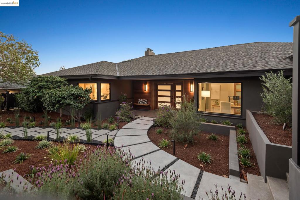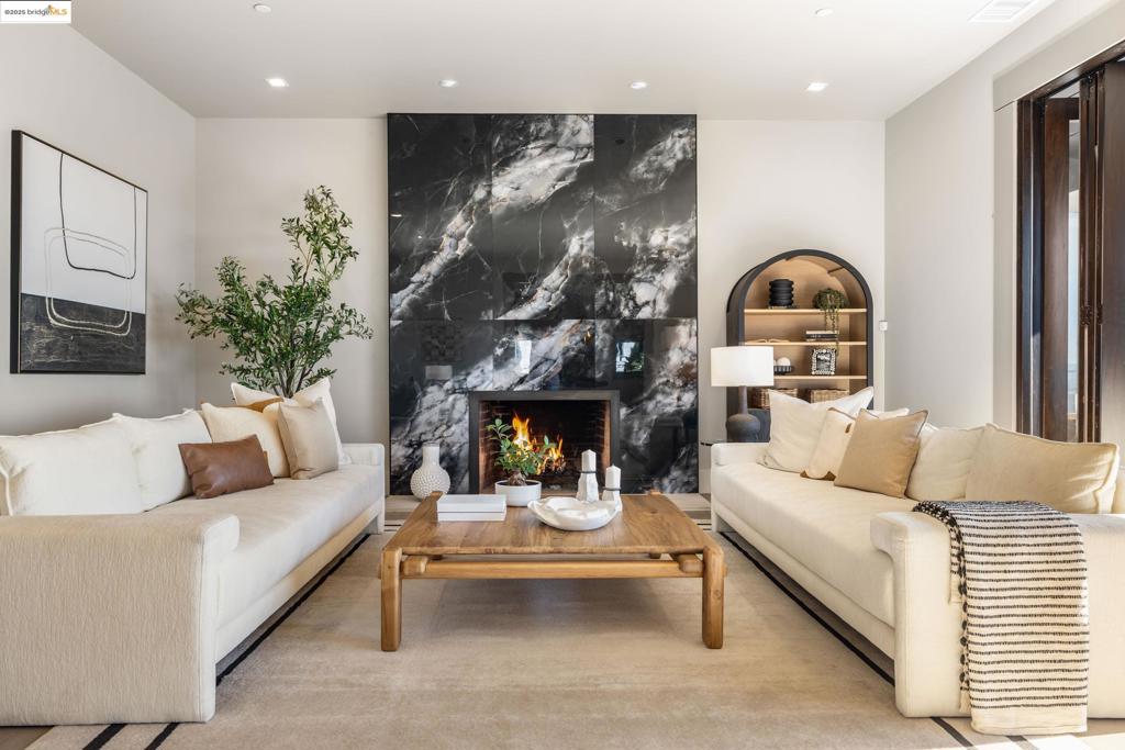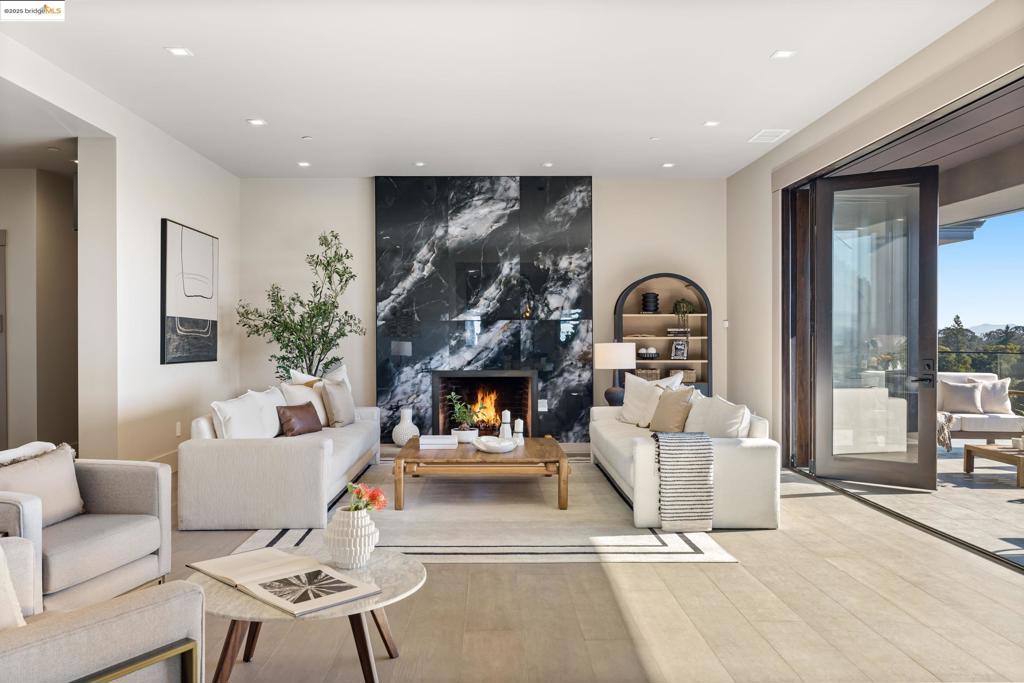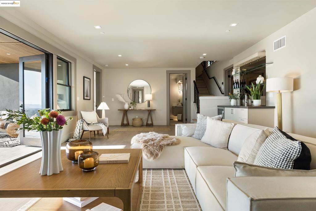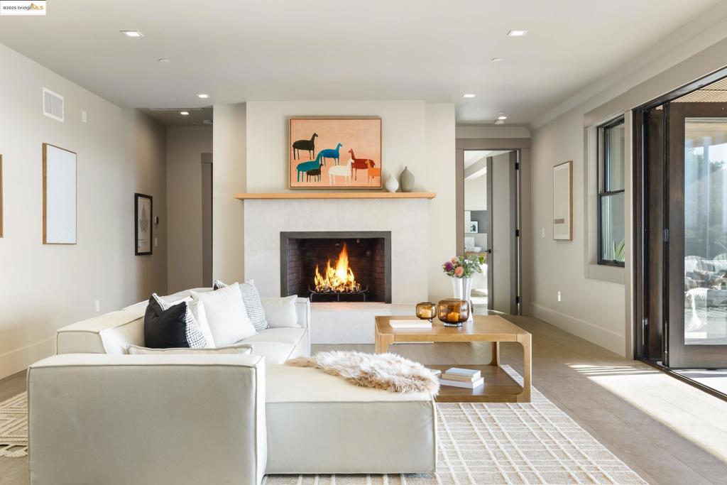Perched in prestigious Claremont Pines, 5737 Country Club Drive is a reimagined 1952 residence that masterfully marries midcentury heritage with contemporary sophistication. Expanded and meticulously renovated, the home embraces natural light, clean lines, and sweeping views of the San Francisco Bay and skyline. A private garden entry and custom pivot door lead to the main level, where a dramatic living room with fireplace and wall-to-wall glass accordion doors open to a deck with frameless railings. At the heart of the home, the kitchen and dining room showcase a sculpted stone island with dual faucets, a bespoke coffee bar with brass sink, & a prep bar with wine fridge, and secondary dishwasher. A pantry, laundry suite, two powder rooms, garage, office, & ensuite bedroom complete the level, while the primary suite offers dual walk-in closets & a spa-inspired bath with glass rain shower, freestanding tub, custom stone vanity, water closet, & sliding doors that frame the view. The lower level features a family room with fireplace and wet bar, two ensuite bedrooms, a theater, wine cellar, flex room, & fitness space opening to landscaped gardens and a flat lawn—seamlessly blending hillside tranquility with urban connectivity for a rare fusion of architecture, setting and lifestyle.