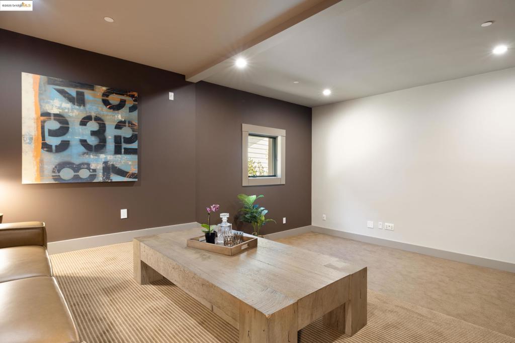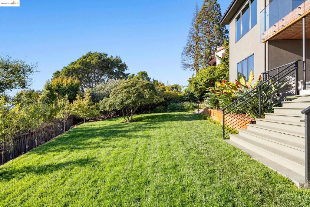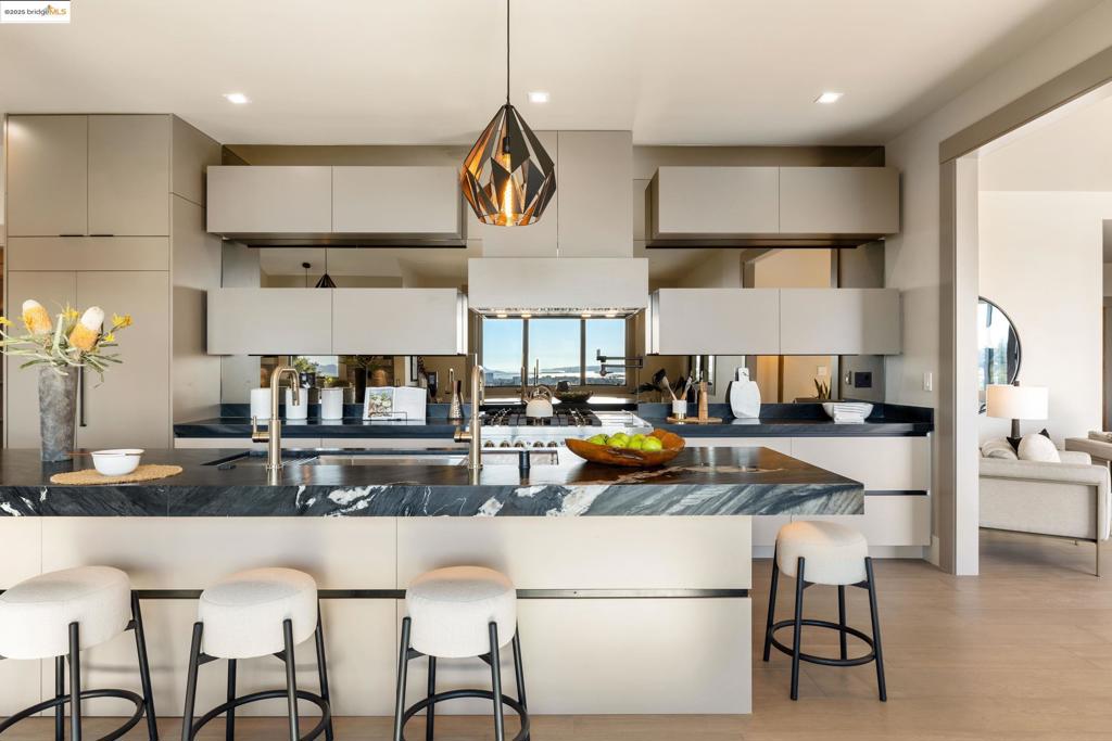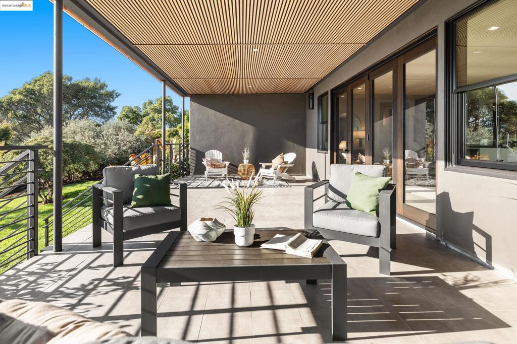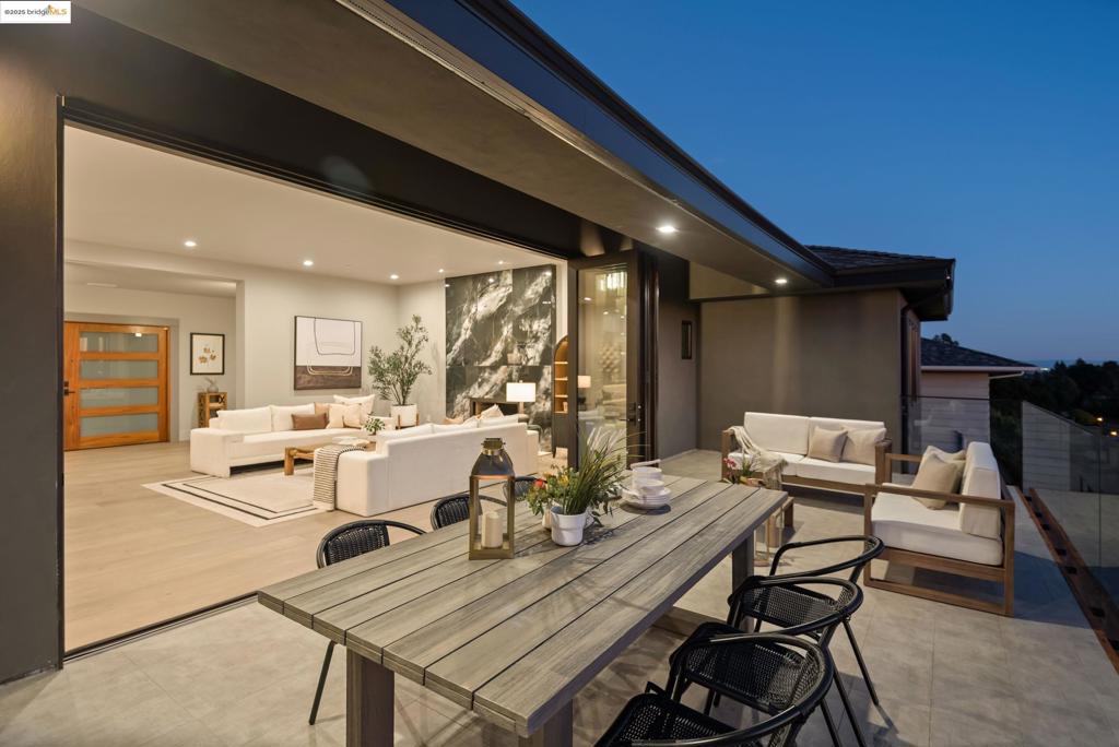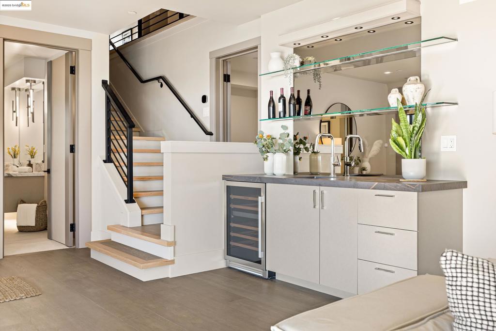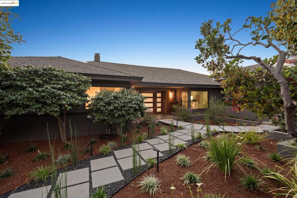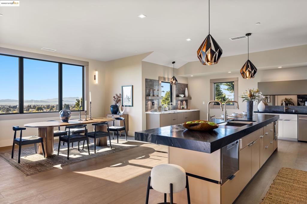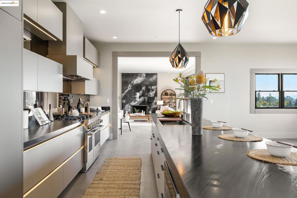 Perched in prestigious Claremont Pines, 5737 Country Club Drive is a reimagined 1952 residence that masterfully marries midcentury heritage with contemporary sophistication. Expanded and meticulously renovated, the home embraces natural light, clean lines, and sweeping views of the San Francisco Bay and skyline. A private garden entry and custom pivot door lead to the main level, where a dramatic living room with fireplace and wall-to-wall glass accordion doors open to a deck with frameless railings. At the heart of the home, the kitchen and dining room showcase a sculpted stone island with dual faucets, a bespoke coffee bar with brass sink, & a prep bar with wine fridge, and secondary dishwasher. A pantry, laundry suite, two powder rooms, garage, office, & ensuite bedroom complete the level, while the primary suite offers dual walk-in closets & a spa-inspired bath with glass rain shower, freestanding tub, custom stone vanity, water closet, & sliding doors that frame the view. The lower level features a family room with fireplace and wet bar, two ensuite bedrooms, a theater, wine cellar, flex room, & fitness space opening to landscaped gardens and a flat lawn—seamlessly blending hillside tranquility with urban connectivity for a rare fusion of architecture, setting and lifestyle.
