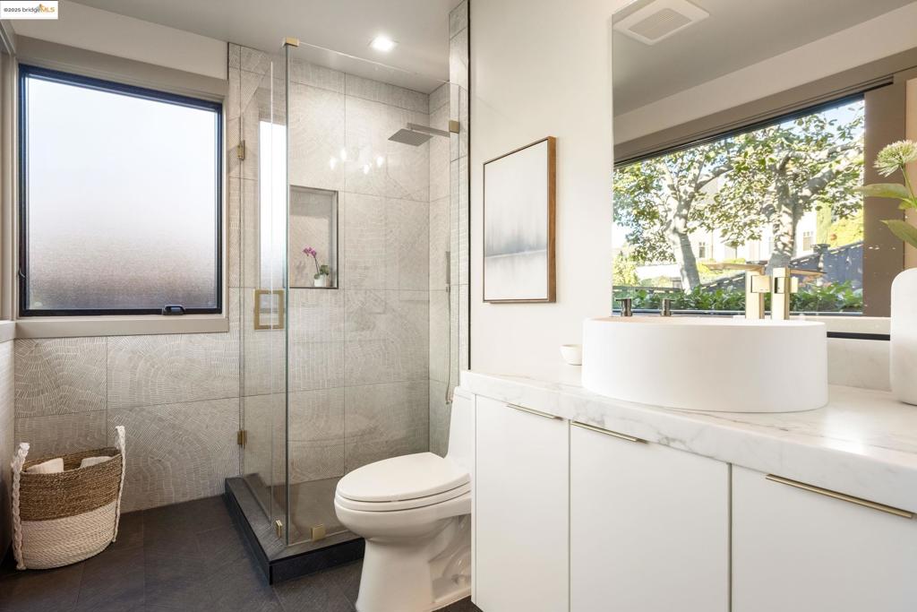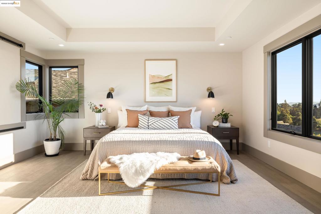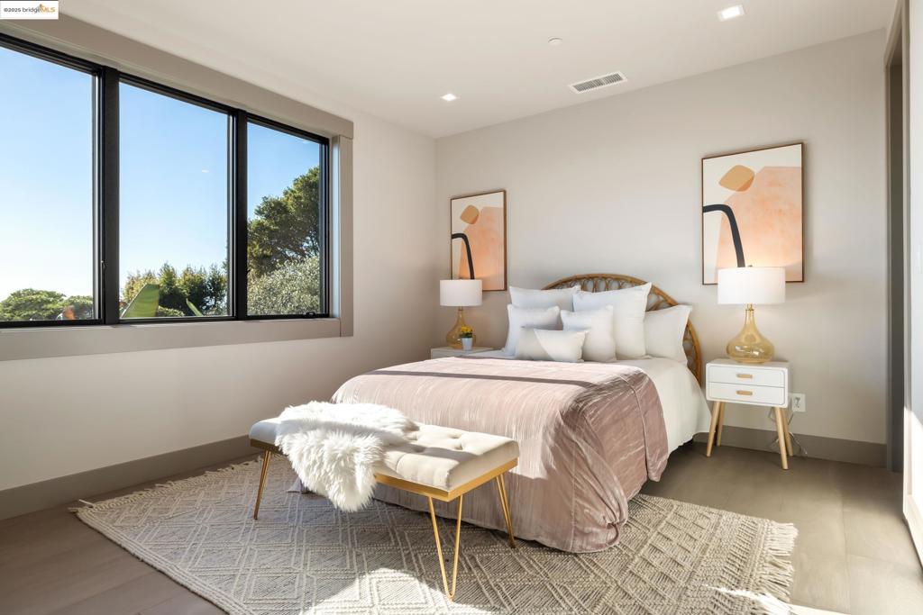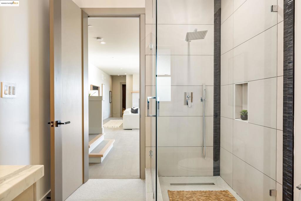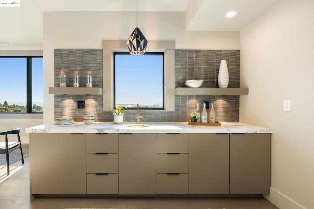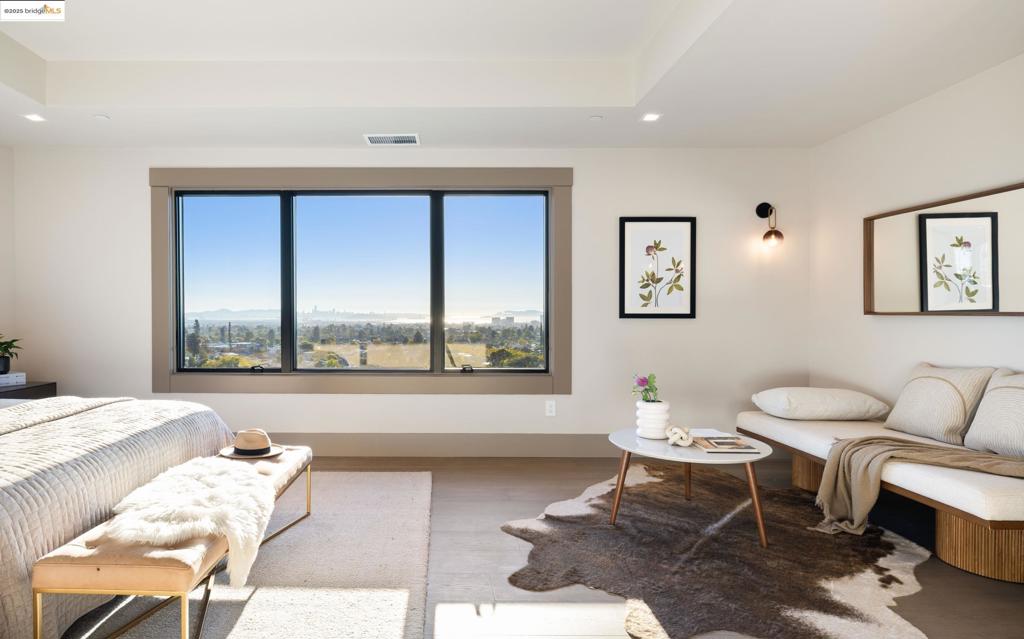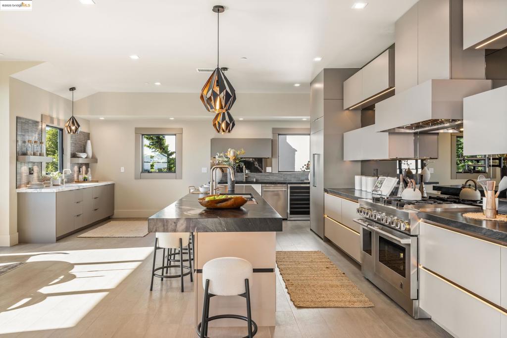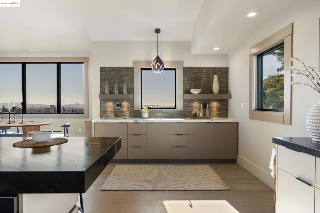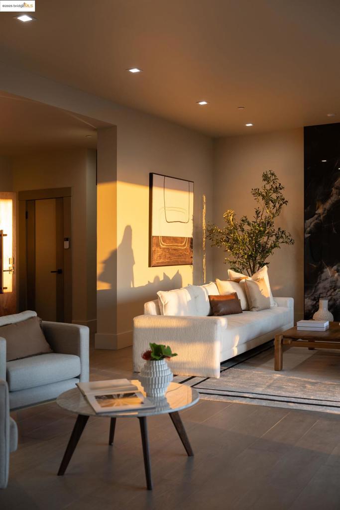 Perched in prestigious Claremont Pines, 5737 Country Club Drive is a reimagined 1952 residence that masterfully marries midcentury heritage with contemporary sophistication. Expanded and meticulously renovated, the home embraces natural light, clean lines, and sweeping views of the San Francisco Bay and skyline. A private garden entry and custom pivot door lead to the main level, where a dramatic living room with fireplace and wall-to-wall glass accordion doors open to a deck with frameless railings. At the heart of the home, the kitchen and dining room showcase a sculpted stone island with dual faucets, a bespoke coffee bar with brass sink, & a prep bar with wine fridge, and secondary dishwasher. A pantry, laundry suite, two powder rooms, garage, office, & ensuite bedroom complete the level, while the primary suite offers dual walk-in closets & a spa-inspired bath with glass rain shower, freestanding tub, custom stone vanity, water closet, & sliding doors that frame the view. The lower level features a family room with fireplace and wet bar, two ensuite bedrooms, a theater, wine cellar, flex room, & fitness space opening to landscaped gardens and a flat lawn—seamlessly blending hillside tranquility with urban connectivity for a rare fusion of architecture, setting and lifestyle.