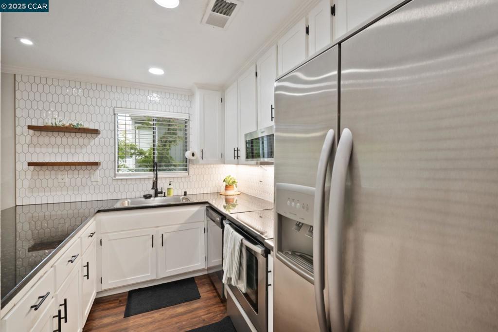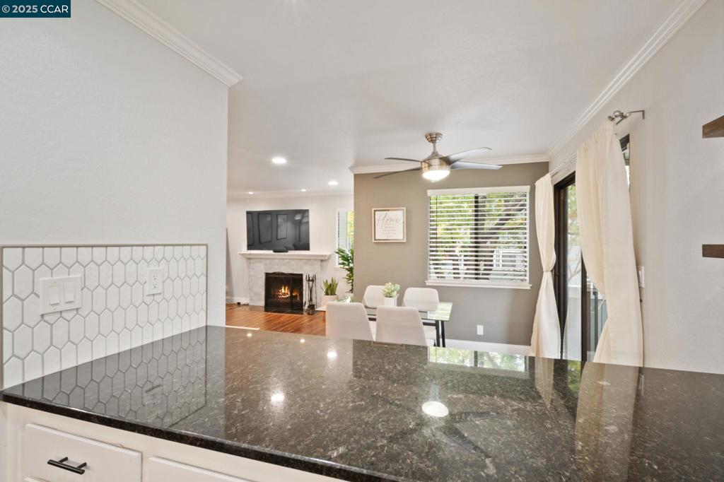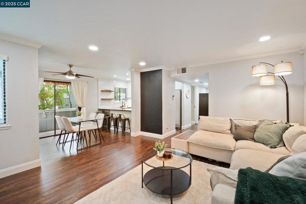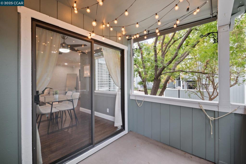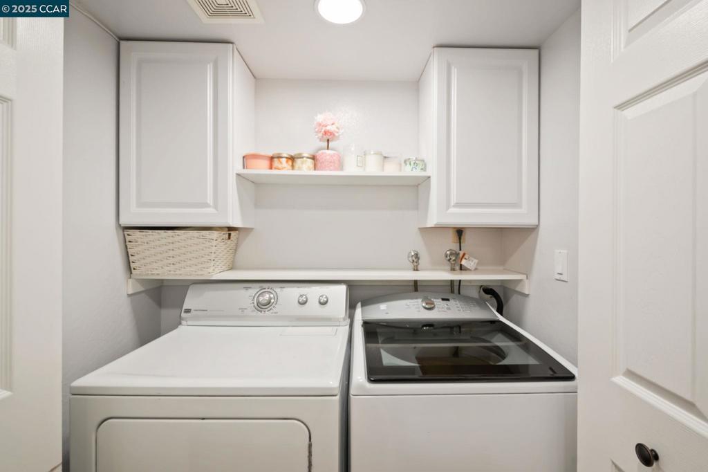 This FULLY UPDATED end-unit home has been thoughtfully upgraded with designer paint, blinds, luxury vinyl plank flooring throughout, and IN UNIT laundry! The kitchen features a new microwave, backsplash, shelving, automatic glass rinser, built-in wine fridge, and all appliances—including the washer, dryer, and refrigerator—convey. Featuring 2 bedrooms and 2 fully remodeled bathrooms, the primary suite offers a spa-like retreat with dual shower heads, an LED lighted mirror, and a custom closet organizer. Step outside to your private patio and enjoy beautiful string lights while relaxing or entertaining. Additional highlights include a cozy wood-burning fireplace, Nest smart-home features, a one-car garage plus an assigned carport, and HOA-covered water, garbage, cable, internet, and 2 swimming pools! This move-in ready home combines modern updates with a warm, inviting atmosphere—perfect for enjoying all that the community has to offer.