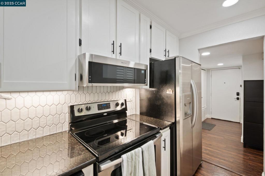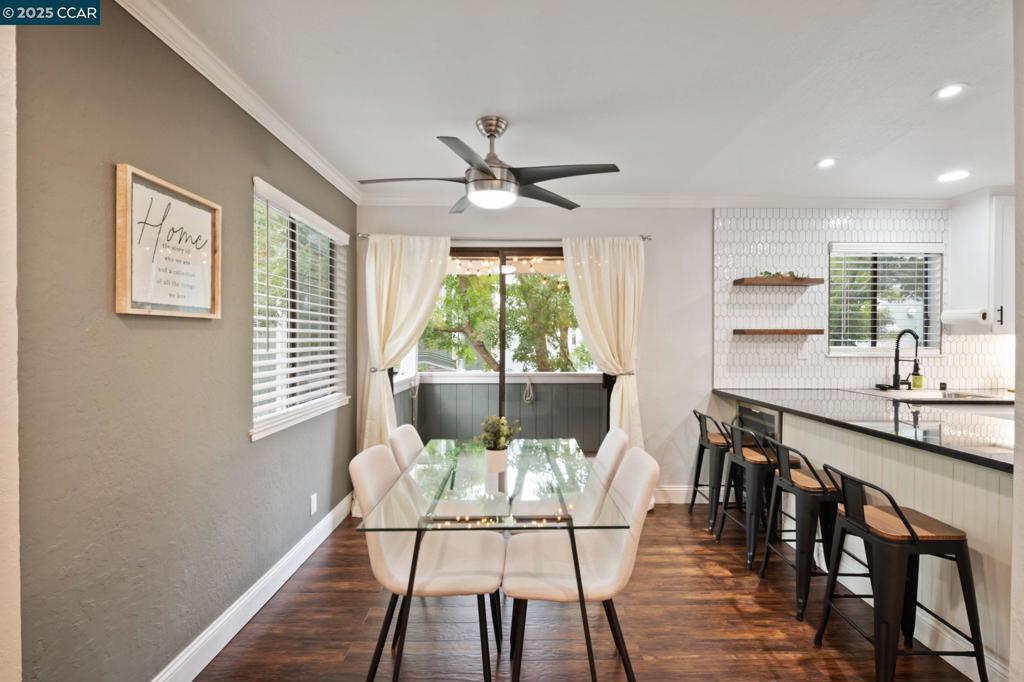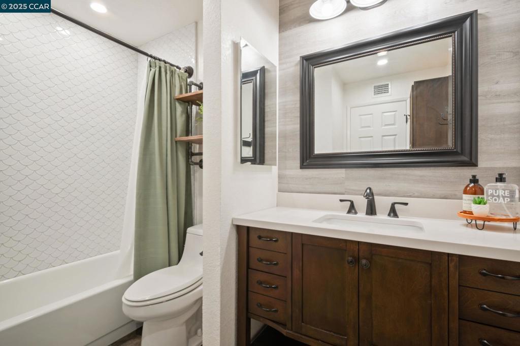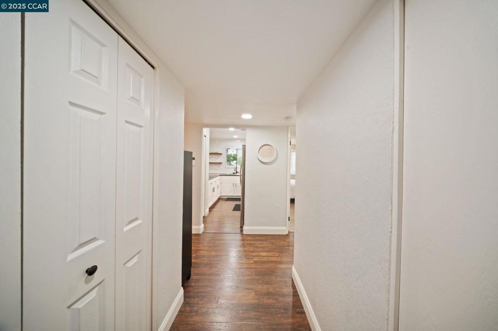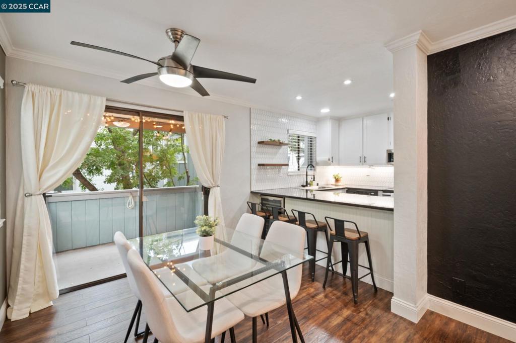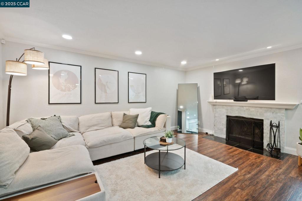 This FULLY UPDATED end-unit home has been thoughtfully upgraded with designer paint, blinds, luxury vinyl plank flooring throughout, and IN UNIT laundry! The kitchen features a new microwave, backsplash, shelving, automatic glass rinser, built-in wine fridge, and all appliances—including the washer, dryer, and refrigerator—convey. Featuring 2 bedrooms and 2 fully remodeled bathrooms, the primary suite offers a spa-like retreat with dual shower heads, an LED lighted mirror, and a custom closet organizer. Step outside to your private patio and enjoy beautiful string lights while relaxing or entertaining. Additional highlights include a cozy wood-burning fireplace, Nest smart-home features, a one-car garage plus an assigned carport, and HOA-covered water, garbage, cable, internet, and 2 swimming pools! This move-in ready home combines modern updates with a warm, inviting atmosphere—perfect for enjoying all that the community has to offer.
