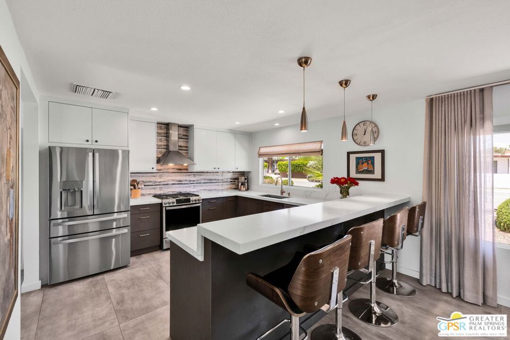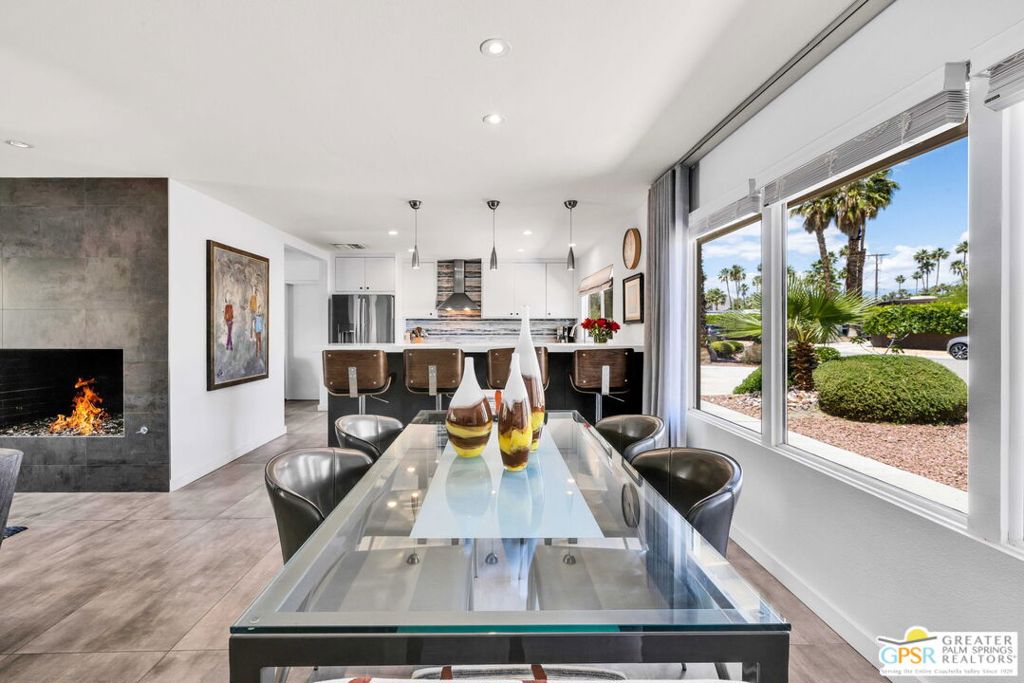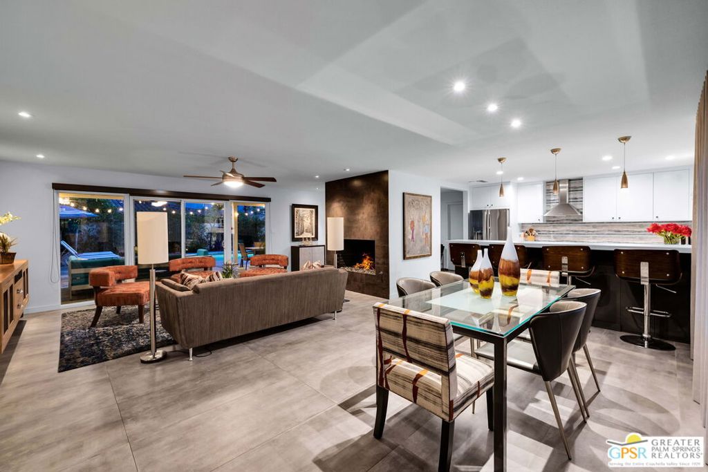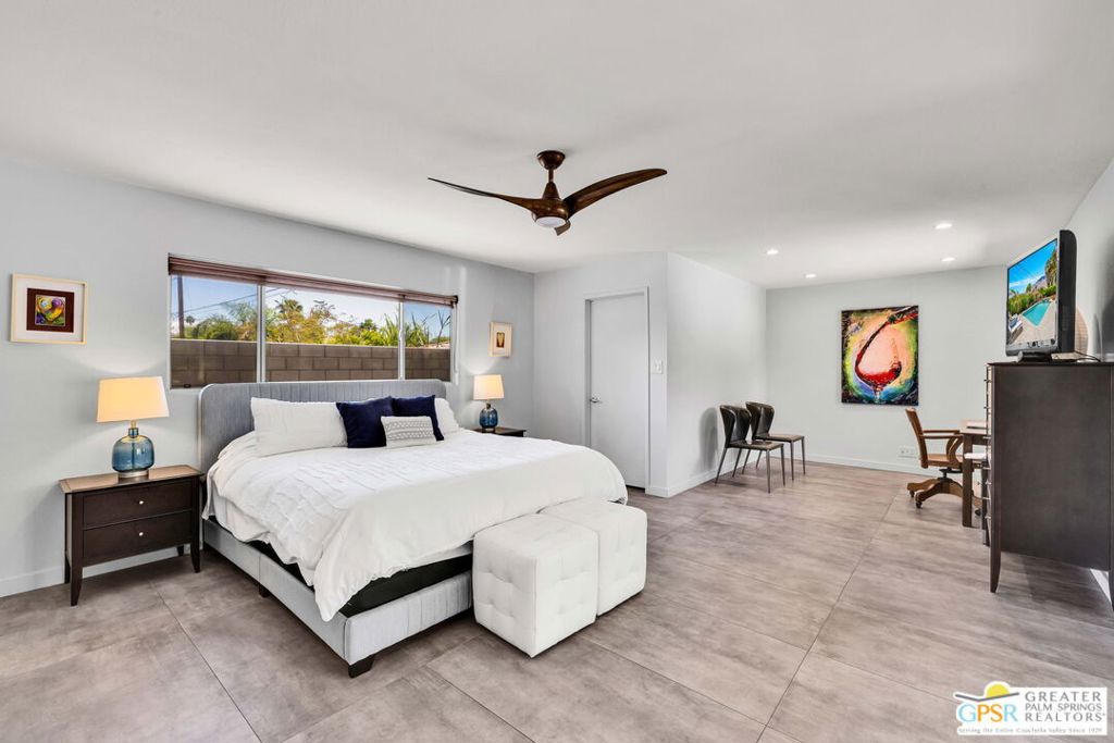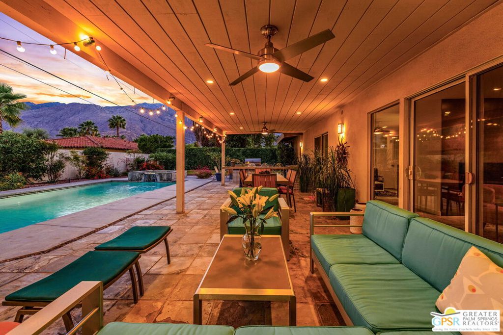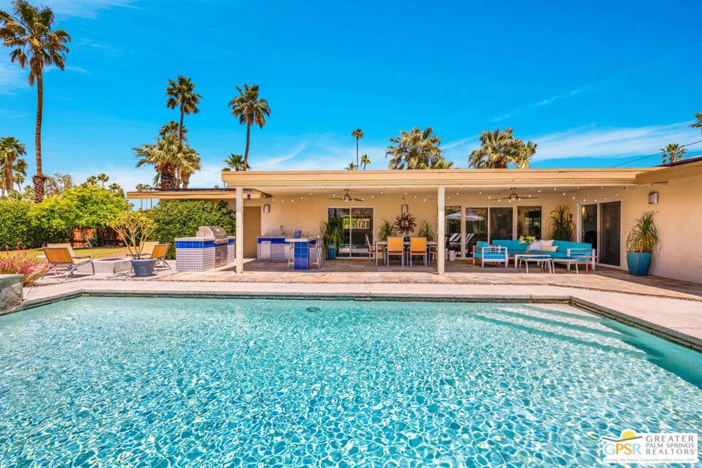 Set in the heart of Palm Springs' Movie Colony East, this updated desert home offers a sought-after lifestyle at a price buyers have been waiting to see. Situated on a 10,000+ sq. ft. lot, this 2-bedroom, 2-bath residence offers 1,630 sq. ft. of living space designed for easy indoor-outdoor living. Porcelain tile floors run through the main spaces, with travertine in the baths. The kitchen features quartz countertops, custom cabinetry, and Bosch and GE Profile appliances, well-suited for both everyday living and entertaining. The primary suite includes a walk-in closet and a flexible bonus space ideal for a home office, fitness area, or quiet retreat. Recent upgrades include a newer HVAC system (2021), dual-pane windows and doors, a 200-amp panel (2017), and 22 owned solar panels (2018). The backyard delivers the ultimate Palm Springs experience with a large pool and raised spa, outdoor kitchen with grill, sink, bar, and built-in ice chest, plus a lush lawn area and fire pit, all set against San Jacinto Mountain views. Included plans for an approximately 800 sq. ft. expansion add further upside, with a family room, bar, dining area, laundry, half bath, and an attached studio casita. Move-in ready with room to grow, this is an opportunity that aligns location, lifestyle, and value.
