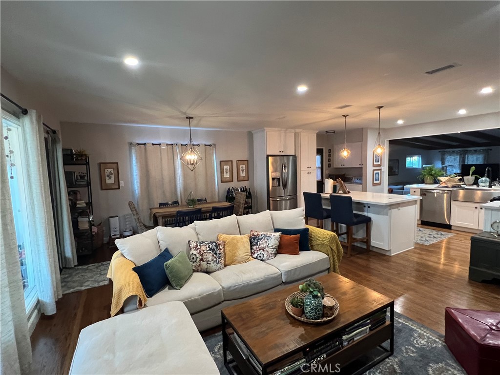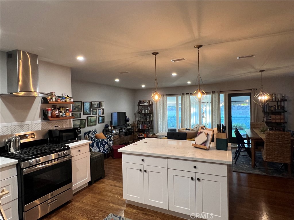 Lovely Long Beach home in the highly sought-after Los Altos neighborhood! Just minutes from the Southern California coast and steps from El Dorado Park, Nature Center, and Golf Course, this beautifully updated 3-bedroom, 2 bathroom residence offers the perfect blend of comfort, convenience, and style. Situated on a 5,828 sq ft lot with 1,608 sq ft of living space, it is turnkey and filled with thoughtful upgrades. Natural light pours into the spacious living room through floor-to-ceiling windows, showcasing recessed lighting, and stunning geometric pendant fixtures in the entry, kitchen, and dining areas that add a touch of modern flair. The remodeled kitchen features granite countertops, a large island with extra storage and seating, soft-close cabinetry, a farmhouse apron sink, stainless steel appliances including a gas stove with vent hood, and a custom herringbone backsplash with Forever Grout. A cozy den with a beamed ceiling and striking herringbone-tiled fireplace is brightened by a sliding glass door near the front entry. The primary suite serves as a private retreat, with a double-vanity bathroom and walk-in shower. Two additional bedrooms offer generous closets, while hall storage and built-ins add both function and charm, and bathrooms are well-appointed. Throughout the home you’ll find oil-rubbed bronze hardware and fixtures, ceiling fans in every room, custom window treatments, and original hardwood floors. Recent upgrades include a brand-new central AC unit. Outdoors, enjoy a welcoming and landscaped backyard with a covered patio perfect for entertaining, a flourishing Meyer lemon tree, a storage shed, and a fully fenced perimeter with brick walls and secure metal gates. The two-car garage, complete with side window and door, is complemented by driveway parking for two additional vehicles, a total of four parking spaces—an uncommon find in Long Beach. This Los Altos home offers unbeatable convenience—close to Los Alamitos Medical Center, Long Beach Memorial Medical Center, California State University Long Beach, and Long Beach City College. Easy access to the 405, 605, and 22 freeways, proximity to Long Beach Airport, John Wayne Airport, and LAX makes commuting and travel a breeze. Combining modern upgrades, timeless details, and an enviable location, 6110 E Walton Street, Long Beach, CA 90815 is a rare opportunity to experience the very best of Southern California living.