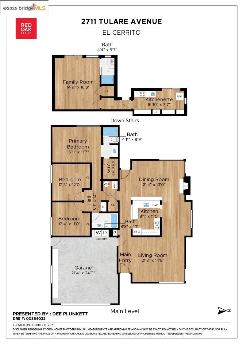 Welcome to beautiful 2711 Tulare Avenue in the desirable Mira Vista neighborhood of El Cerrito. This impeccably maintained Ranch-style home has it all! Three bedrooms & 2 full baths - including a spacious primary suite - plus an expansive living room. The updated kitchen is a standout, flowing seamlessly into the large adjacent family room with a fireplace. Enjoy formal meals at the dining room table or a cafe-style nosh at the kitchen counter. Throughout the main area, you'll find gleaming hardwood floors. Cozy wall-to-wall carpeting in the bedrooms. Tons of closet space! Need more? How about an ADU? There's a bedroom & bath downstairs with a separate entrance. Covered deck, perfect for enjoying gorgeous sunsets. Large, private landscaped yard with colorful, pollinator-friendly plants & veggie beds; ideal for gardening, entertaining, or simply relaxing! Two-car garage with laundry & interior access. Close to shopping, schools, the popular Mira Vista Dog Park, Wildcat Canyon & transportation. You will fall in love with this home!