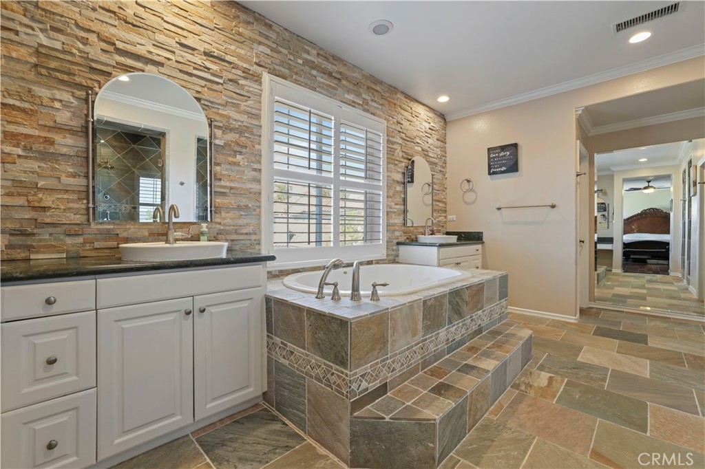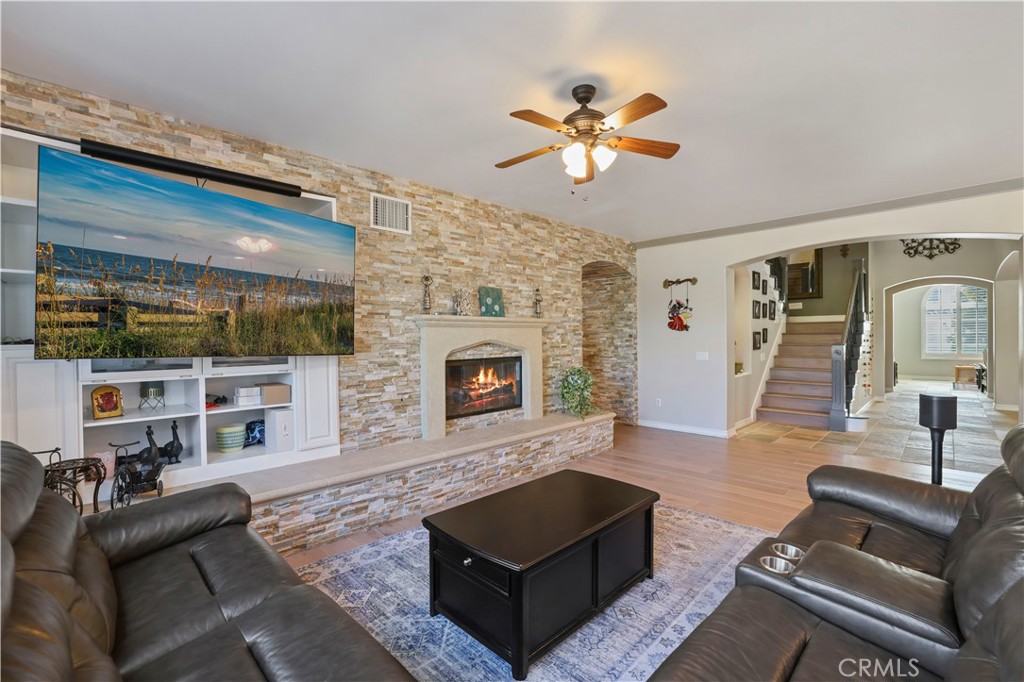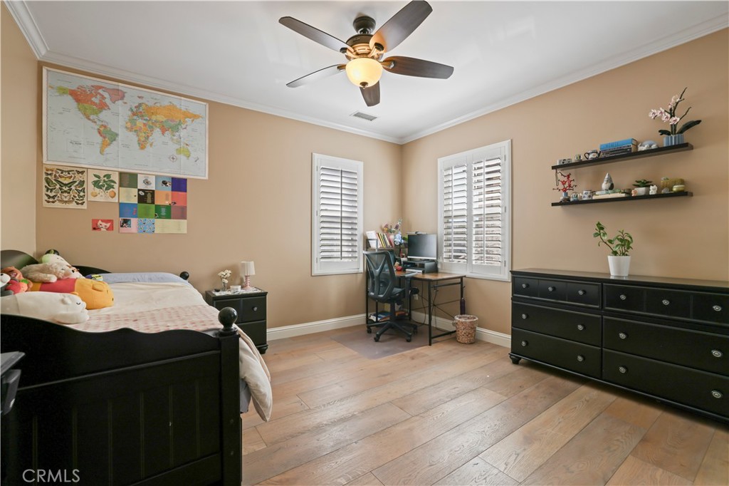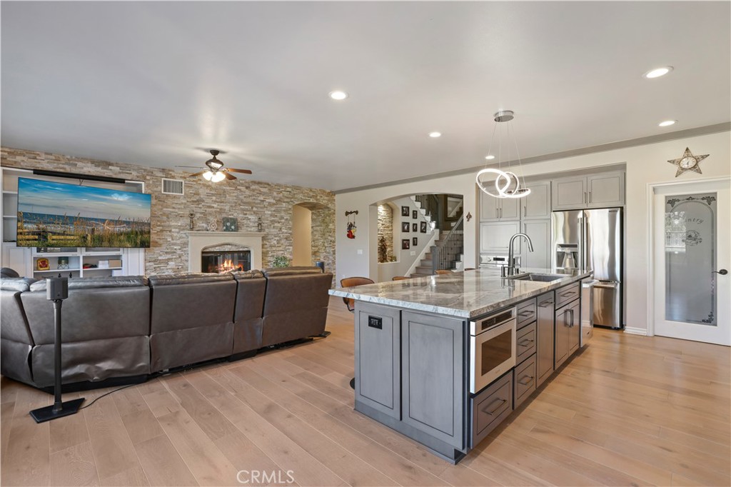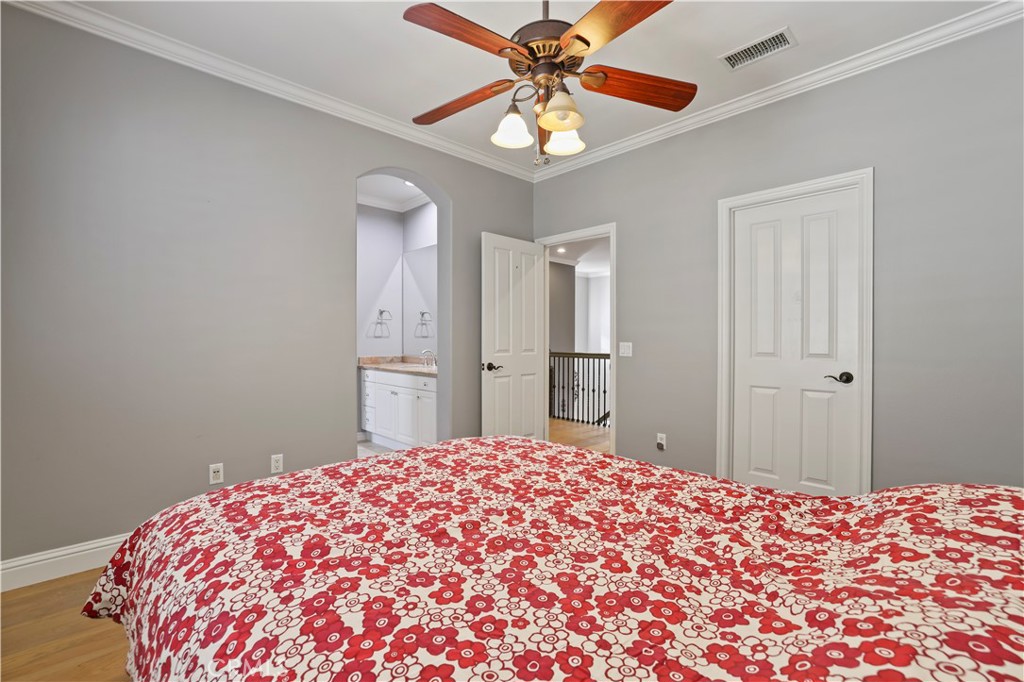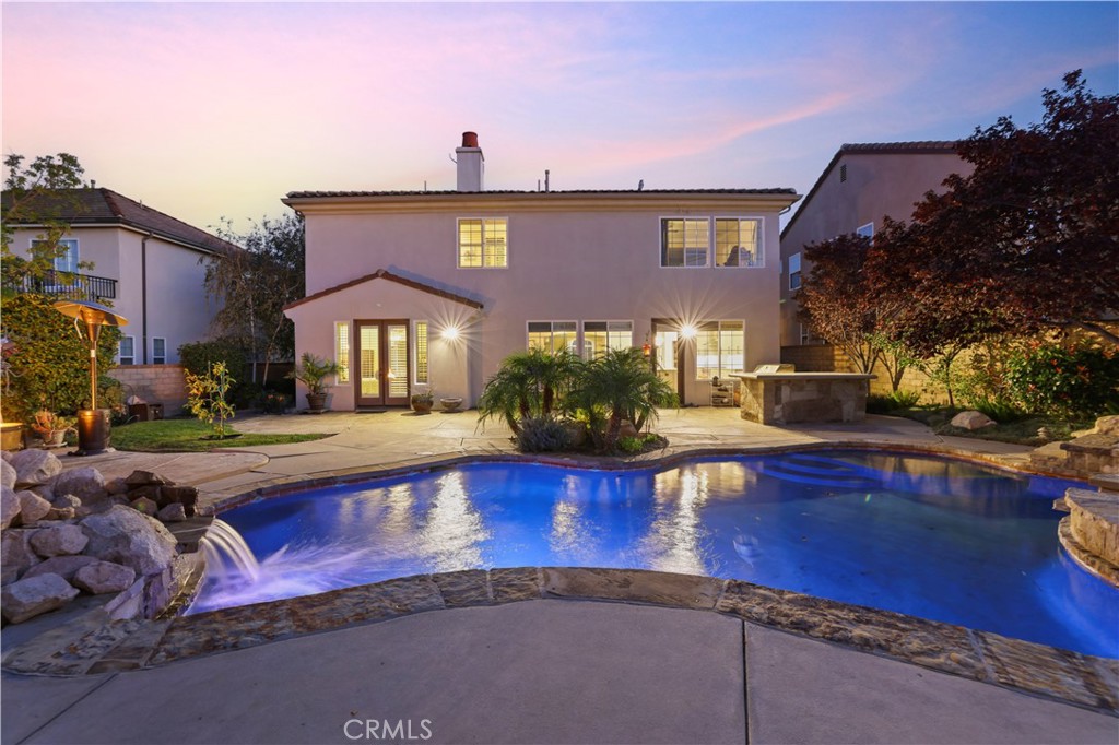 Welcome to this gorgeous Westridge Executive home in Valencia with this popular floor plan, the Masters! This 5 bedrooms and 5 bathrooms estate nestled at the end of the cul-de-sac boasting almost 4000 ft.² with a spectacular new Chef’s kitchen features a custom maple cabinets, large center island with high-end appliances along with the hidden cappuccino station. Cozy up by the fireplace in the family room with newly installed hardwood floors throughout and soak the views of your private backyard. The outdoor space has a saltwater pool with a jacuzzi, built-in BBQ station with ample space for entertaining without rear neighbors. This estate has a main floor bedroom and a full bathroom plus a guest powder room and 3 more en suite beds and baths upstairs including a Jack and Jill as well. Enjoy a built-in office nook perfect for office or homework space with front yard balcony. The primary suite upstairs has a panoramic view of the mountain with a large walk-in closet, his and hers sink with a makeup station and a custom walk-in double shower. Additional features include plantation shutters, designer window coverings with a switch of a button, custom cabinets in all bedroom closets. The two car garage features epoxy flooring and the third car tandem provides a storage with new built-in cabinets with a space for a gym and an EV charger included. Conveniently located a few blocks the blue ribbon schools at Oak Hills elementary, Rancho Pico Junior High and West Ranch High high school. Just minutes away from 5 freeway and 126 Highway, Valencia Town Center, parks, restaurants , shopping center, with Low HOA and no Mello Roos. The solar panels are leased and it has 7 years left. This community has a rentable clubhouse, 2 large swimming pools with spa, pickleball and tennis courts, basketball court and private kids park with swings/slides, and has a membership golf course.