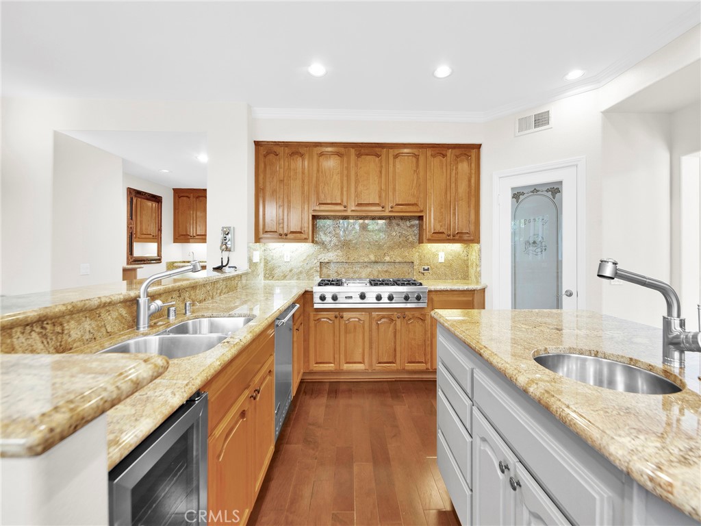 Aggressively Priced and offering exceptional value in the prestigious Legacy Estates of Wood Ranch. Situated behind the gates in one of Simi Valley's most desirable enclaves, this gorgeous two-story residence blends timeless elegance with modern comfort. Featuring 4 bedrooms, 3.5 baths, a large study, and a spacious bonus/possible 5th bedroom, the home welcomes you with soaring cathedral ceilings and an inviting, light-filled floor plan. The elegant formal dining room is perfect for entertaining, while the central vacuum system adds everyday convenience. The expansive chef's kitchen boasts Viking appliances, Sub-Zero refrigerator, a center island with vegetable sink, abundant cabinetry, and a walk-in pantry opening seamlessly to the warm and comfortable family room with a wet bar. A downstairs bedroom with private en-suite is ideal for guests or multigenerational living. Upstairs, the luxurious primary suite showcases a remodeled spa-inspired bathroom and custom-designed closet. Additional highlights include beautiful marble floors, new carpet, and new hardwood flooring. Located on a quiet cul-de-sac, the property offers a private yard with room for a pool, allowing you to create the outdoor oasis of your dreams.