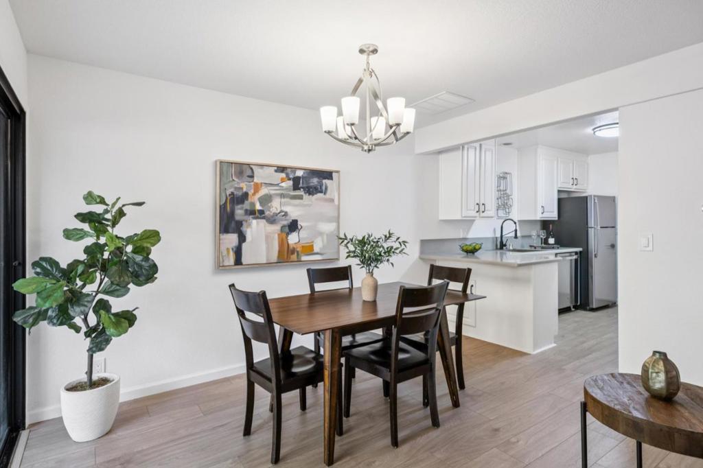 Welcome to this beautifully appointed 2-bedroom, 1.5-bath townhome-style residence offering approximately 1,294 square feet of refined living space in the desirable Rancho Palma Grande community of Santa Clara. Thoughtfully updated and meticulously maintained, this home blends modern sophistication with everyday comfort. The main level features an inviting open-concept living area anchored by a cozy fireplace and sliding glass doors that open to a spacious private yard. Ideal for entertaining or relaxing, the yard offers rare outdoor space for this style of home and includes automatic sprinklers for easy upkeep. The kitchen has been tastefully upgraded with contemporary cabinetry, sleek countertops, luxury vinyl plank flooring, and stainless steel appliances. A remodeled powder room completes the main level. Upstairs, two spacious bedrooms offer tranquil treetop views and generous closet space. Each includes its own remodeled vanity and connects to a shared full bath designed for privacy and functionality. An attached two-car garage adds convenience and value. Residents of Rancho Palma Grande enjoy access to a pool and spa. Ideally located near NVIDIA, AMD, Intel, Applied Materials, and ServiceNow, with easy access to San Tomas Expressway and Highway 101.